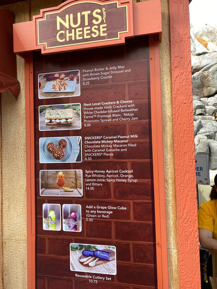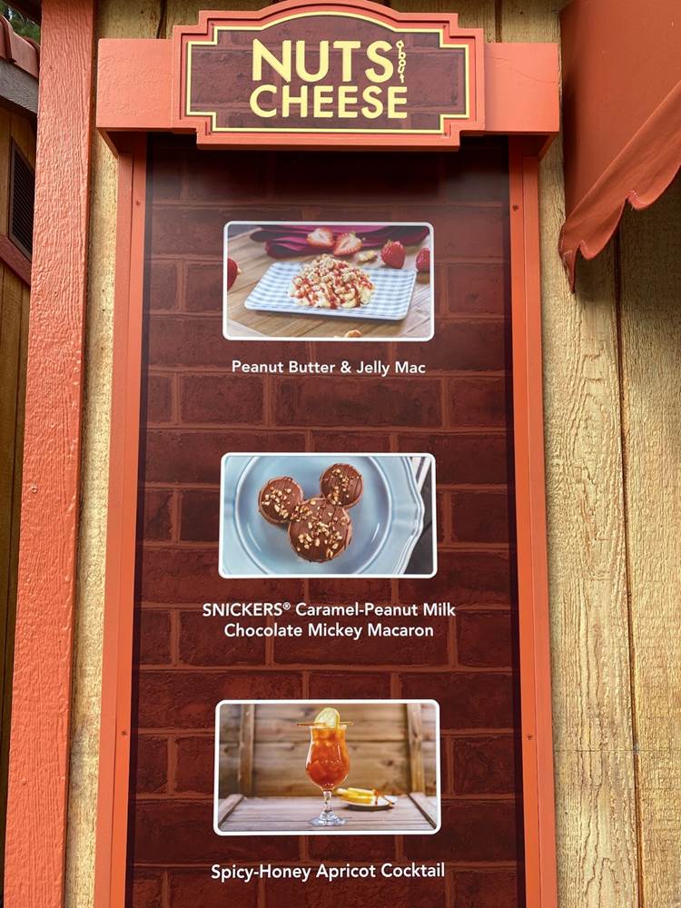 “Nuts About Cheese” features peanut butter & jelly mac, crackers & cheese, a Mickey macaron, and a honey-apricot cocktail.