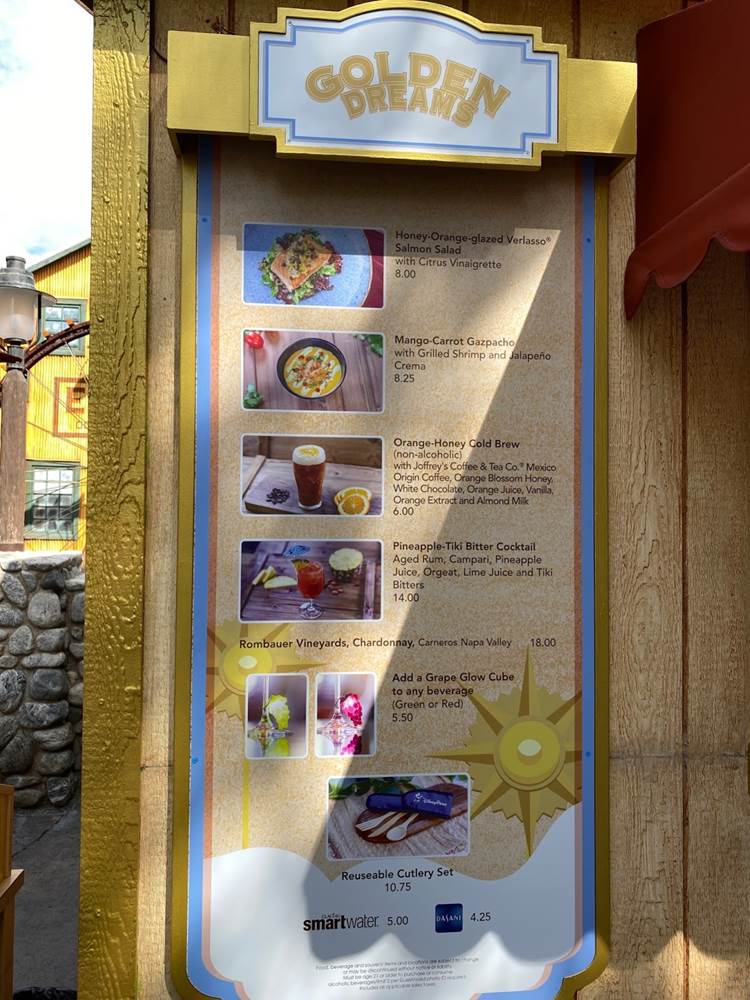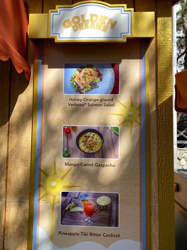 Now let’s start our tour through the food! “Golden Dreams” is located near The Little Mermaid - Ariel’s Undersea Adventure, and features salmon salad, gazpacho, cold brew, and a pineapple-tiki cocktail.