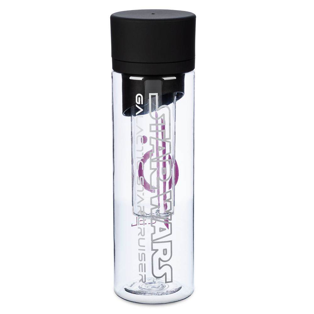 - Finally, the water bottle is clear with a black screw top, and white and pink decorations of the Chandrila Star Line and Star Wars logos. It also includes a clear infuser basket insert to add natural fruit flavor to the water.