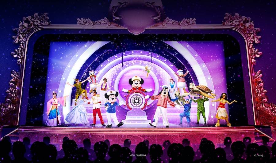 This summer, Disney Cruise Line will welcome the very first guests aboard our newest ship, the Disney Wish. After their first day spent exploring the ship, guests will head to the beautiful Walt Disney Theatre to see an original musical spectacular called Disney Seas the Adventure.