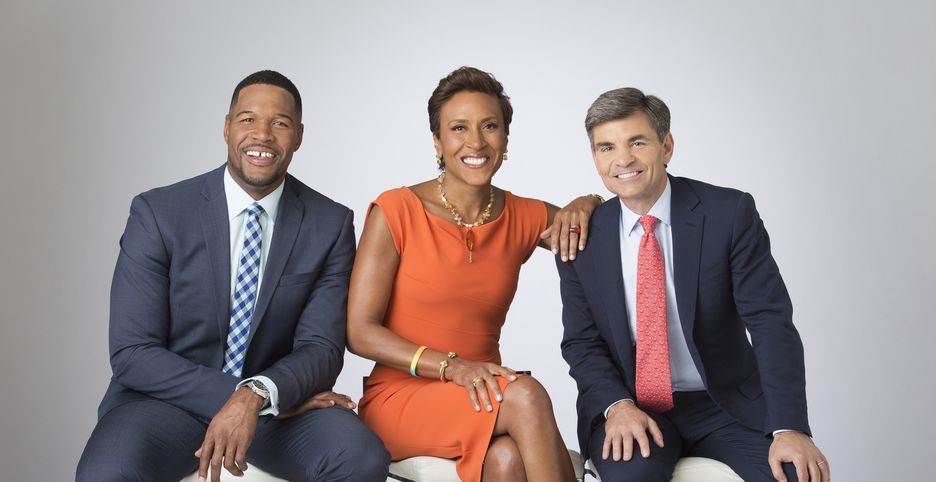 Good Morning America is a two-hour, live program anchored by Robin Roberts, George Stephanopoulos, Michael Strahan and Ginger Zee is the chief meteorologist.