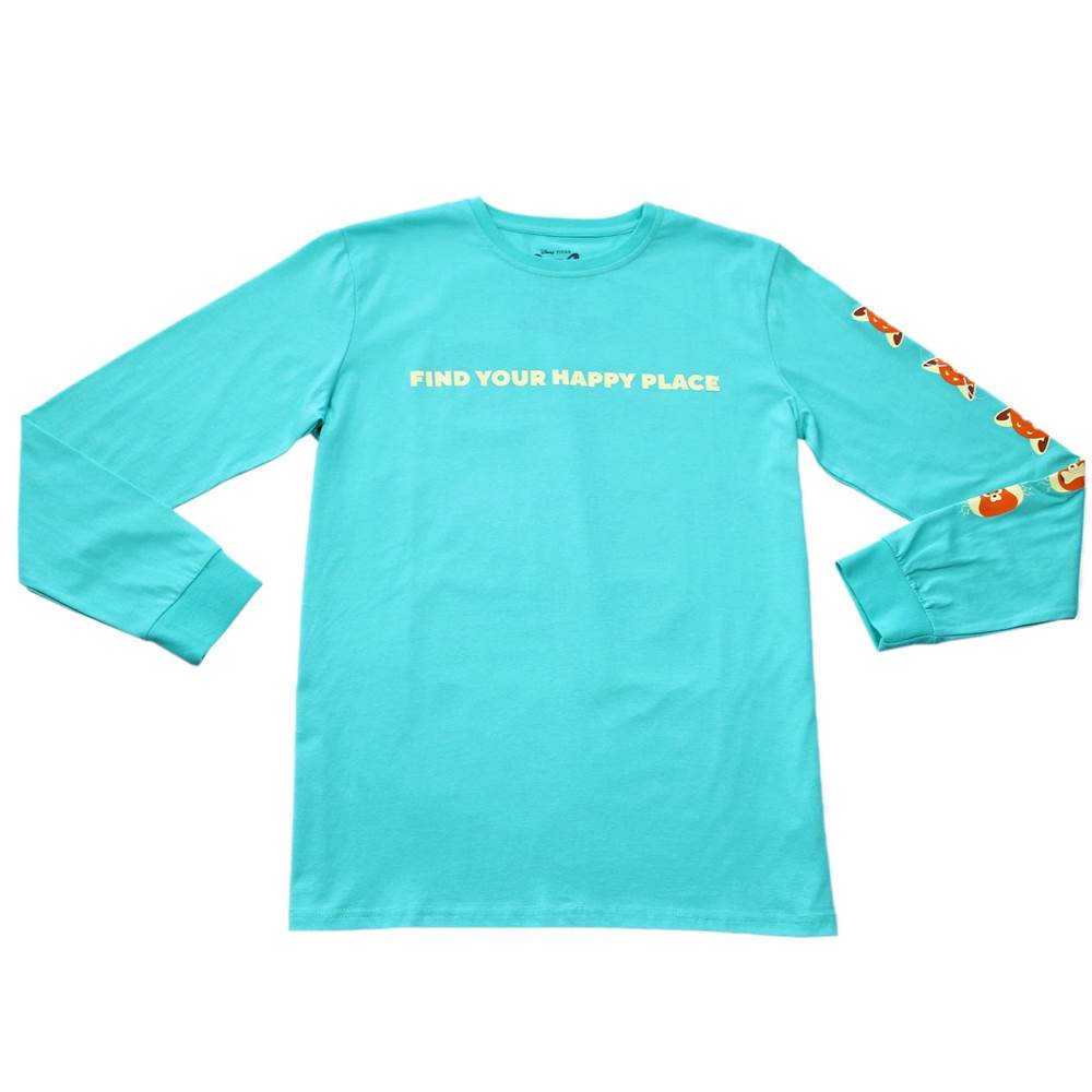 - Stay calm and warm in an aqua colored long sleeve top that reminds wearers to “find your happy place.” The back of the shirt showcases a meditating panda Mei who is at complete peace with who she is.