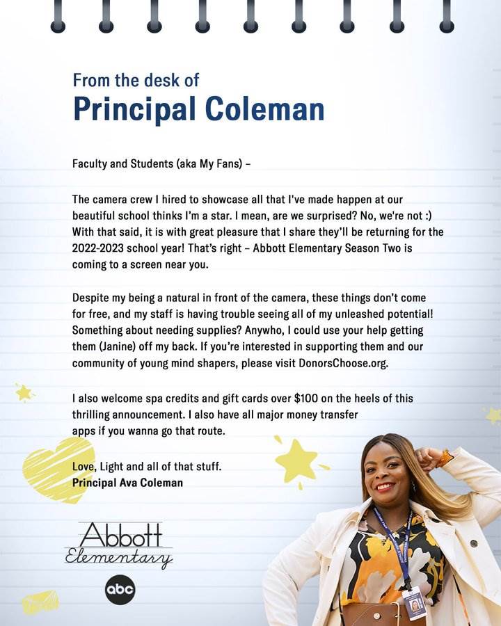 ABC has announced the renewal of their breakout hit television series, Abbott Elementary, via a letter from the fictitious principal from the fictitious school in which the series takes place.