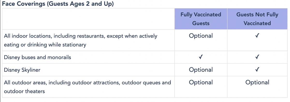 - Additionally, guests who are not fully vaccinated are still asked to wear face coverings indoors (including restaurants, except when actively eating or drinking while stationary) and on all Disney transportation — including the Disney Skyliner.