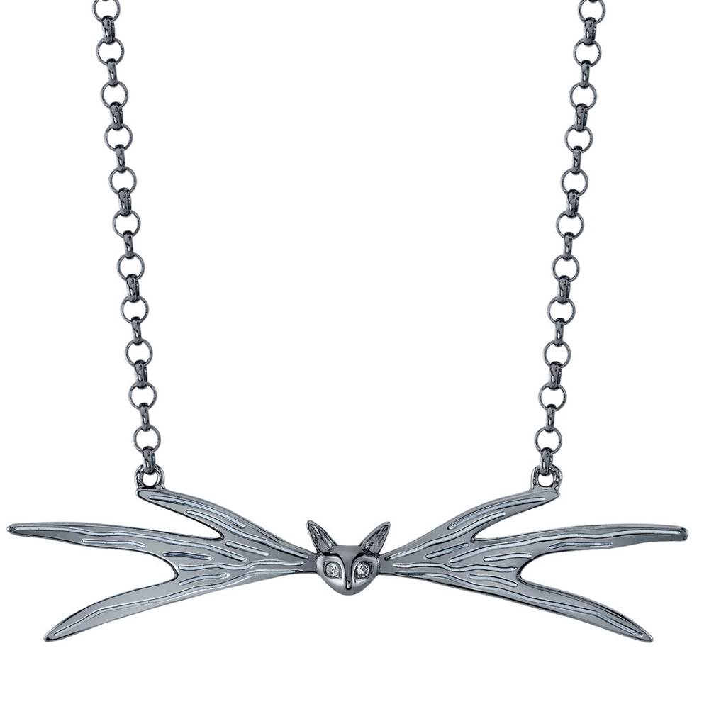 “Strike a dapper pose with this stylishly strange necklace inspired by the Pumpkin King himself, Jack Skellington! Handcrafted in solid silver with a, the bat bow tie is painstakingly accurate to Jack’s seen on-screen. The charmingly sculpted bat head features glittering white crystal eyes, and the striations along the wings are filled with contrasting white enamel.”