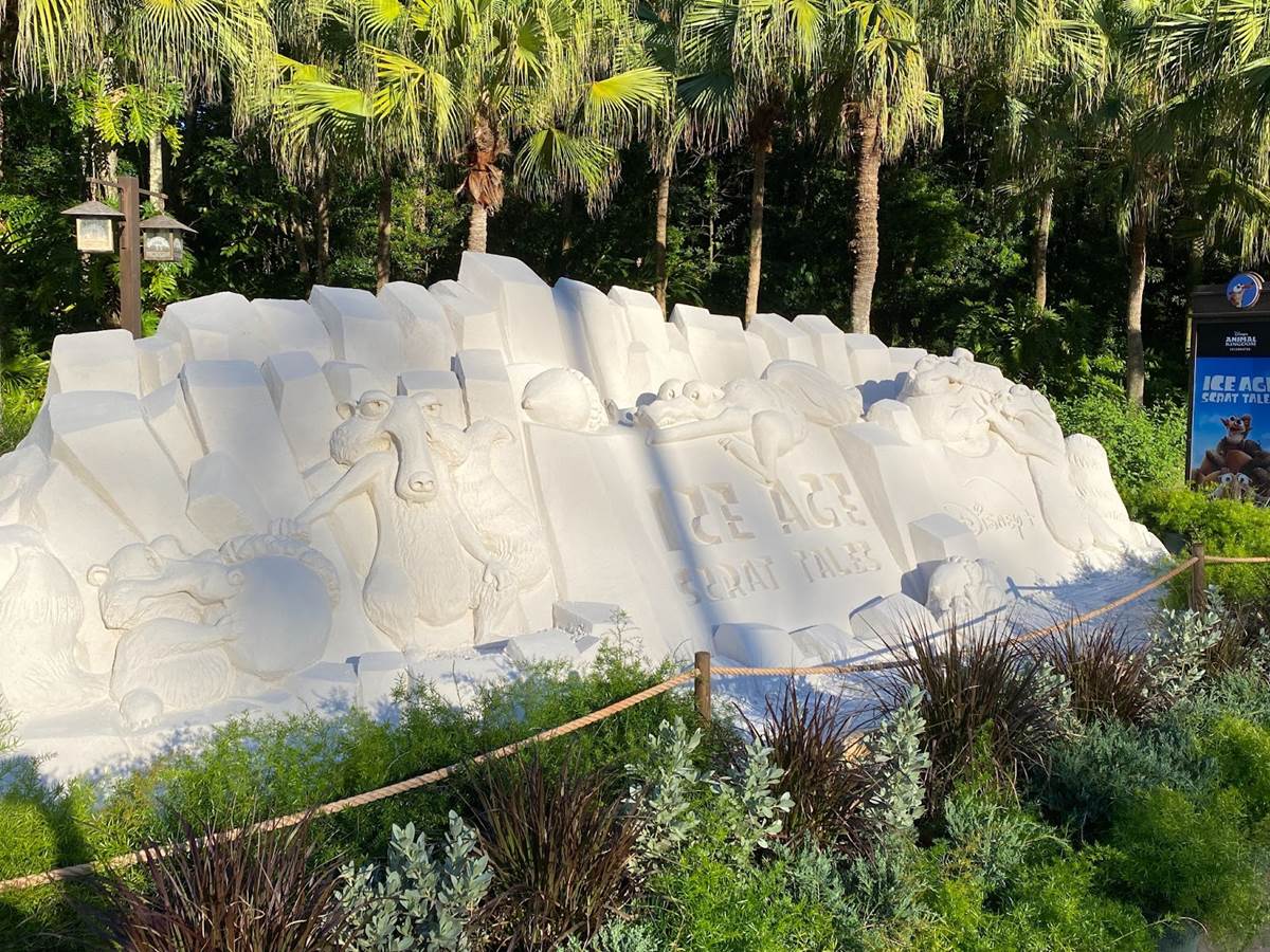 - Just in front of the entrance to Disney’s Animal Kingdom in Walt Disney World, this new sand sculpture for Ice Age: Scrat Tales can be seen.