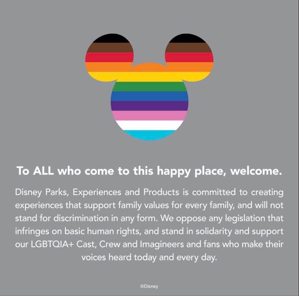 - The Instagram post shared by Disney Parks says: “To ALL who come to this happy place, welcome. Disney Parks, Experiences, and Products is committed to creating experiences that support family values for every family, and will not stand for discrimination in any form. We oppose any legislation that infringes on basic human rights, and stand in solidarity and support our LGBTQIA+ Cast, Crew, and Imagineers and fans who make their voices heard today and every day.”