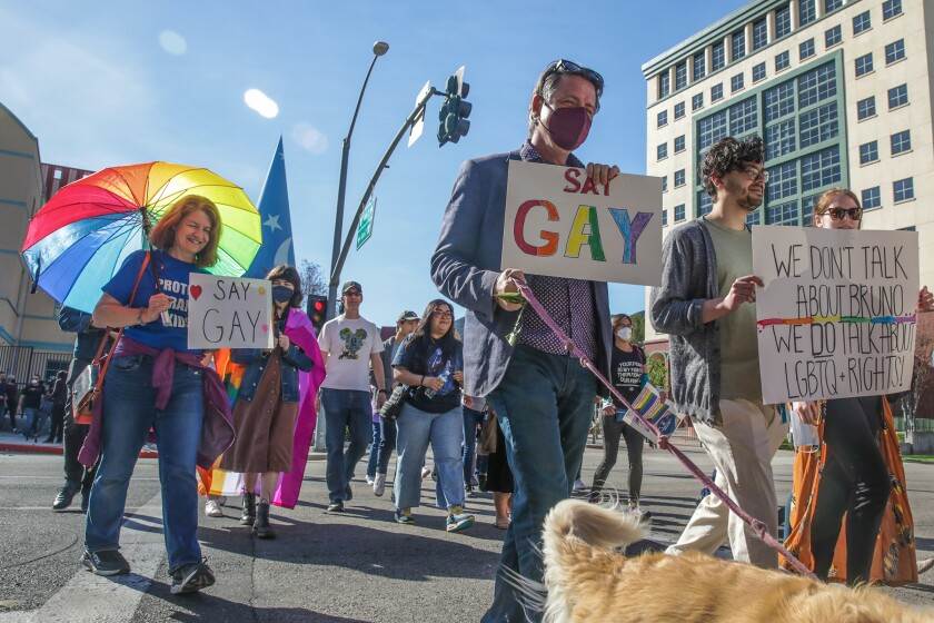 Roughly 100 Cast Members walked out of work yesterday and gathered outside the Roy E. Disney Animation Building in Burbank, California in protest of Florida’s “Don’t Say Gay” bill.