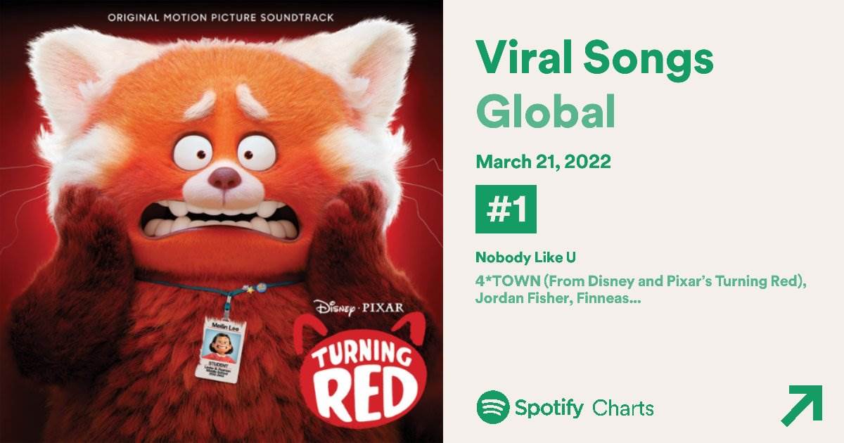 “Nobody Like U” from the Disney Pixar's film “Turning Red” has gone to number one on the Spotify Global Viral Song Chart.