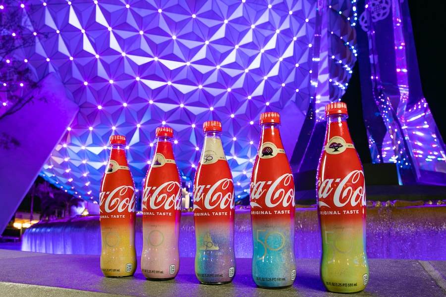 - To celebrate the 50-year collaboration between Walt Disney World Resort and Coca-Cola, five unique co-branded collectible bottles are available exclusively at the resort during the 50th Anniversary Celebration starting today.