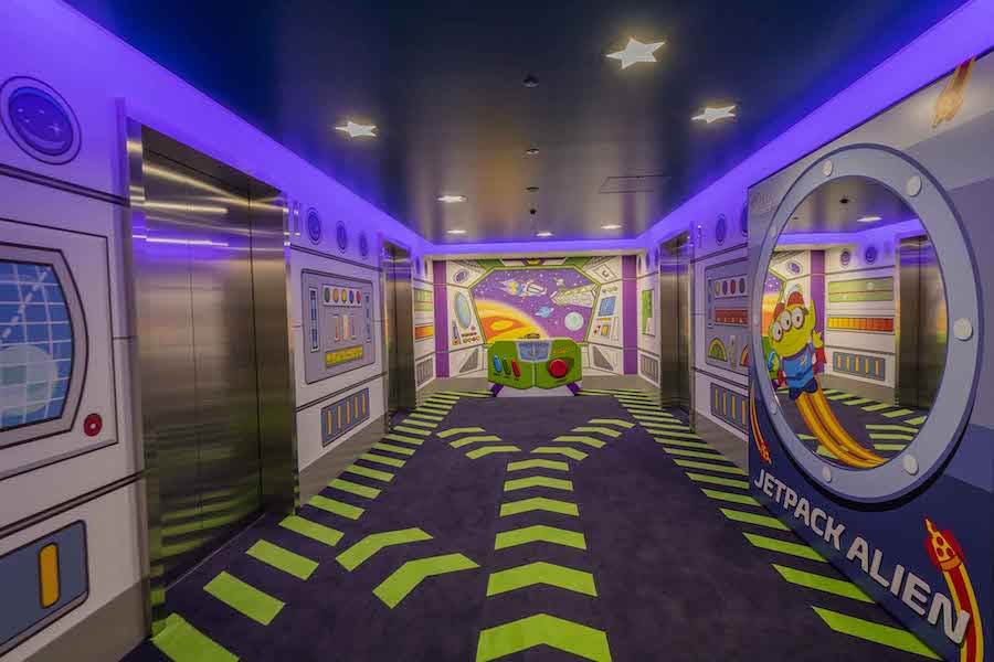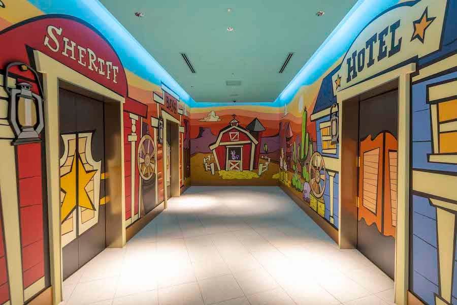 - The bright colors and theming continue through the elevator areas and guest corridors. The hotel has two wings. One side is themed to Buzz Lightyear and the other is themed to Woody’s Roundup.