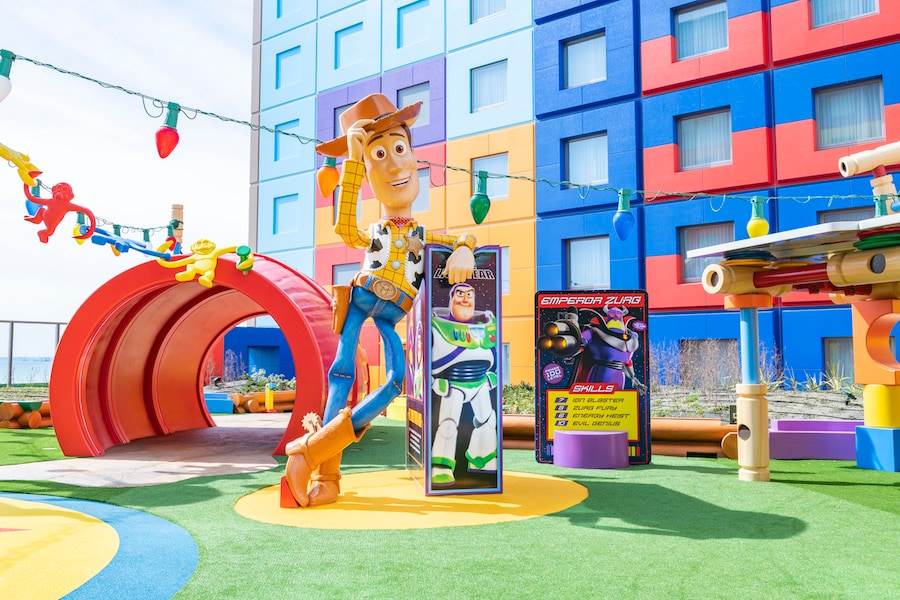 - In the front plaza area of the hotel is Slinky Dog Park, celebrating the fun and joy of playing with toys. Guests will discover oversized toy action figures of Jessie and Buzz Lightyear, nearly 12 feet tall, standing on an enormous Slinky Dog game board.