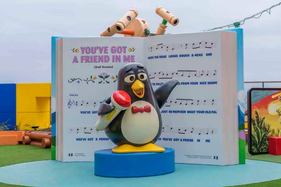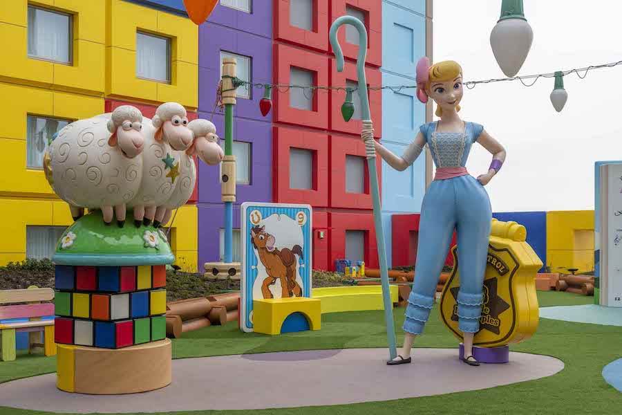 - Facing Tokyo Bay in the back of the hotel, and accessible from behind the lobby, guests will climb stairs past an oversized Hamm operating a toy crane hoisting his Alien friends and enter Toy Friends Square. This area celebrates the beauty, wonder and importance of friendship. Here they will encounter oversized figures of Woody and Bo Peep, Bo’s three-headed sheep, Wheezy the singing penguin, and several other favorite toys.