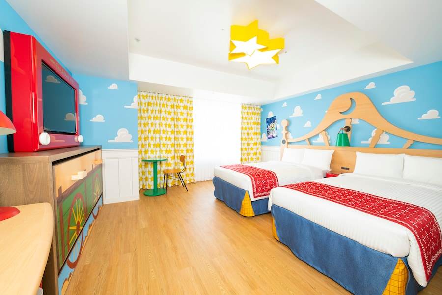 - Guest rooms at the new resort stick to the overall theme and are reminiscent of Andy’s own bedroom, with the iconic cloud motif adorning the walls. The television set is a giant Etch-A-Sketch.