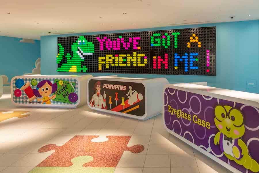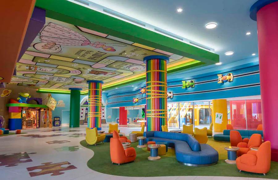 - Walt Disney Imagineering and Pixar Animation Studios collaborated on the design to make guests feel as if they are shrunk to toy-size and are welcomed as “honorary toys.” As the story goes, Andy has assembled this toy hotel so that his toys have a place to stay and play while he is away at Cowboy Camp.