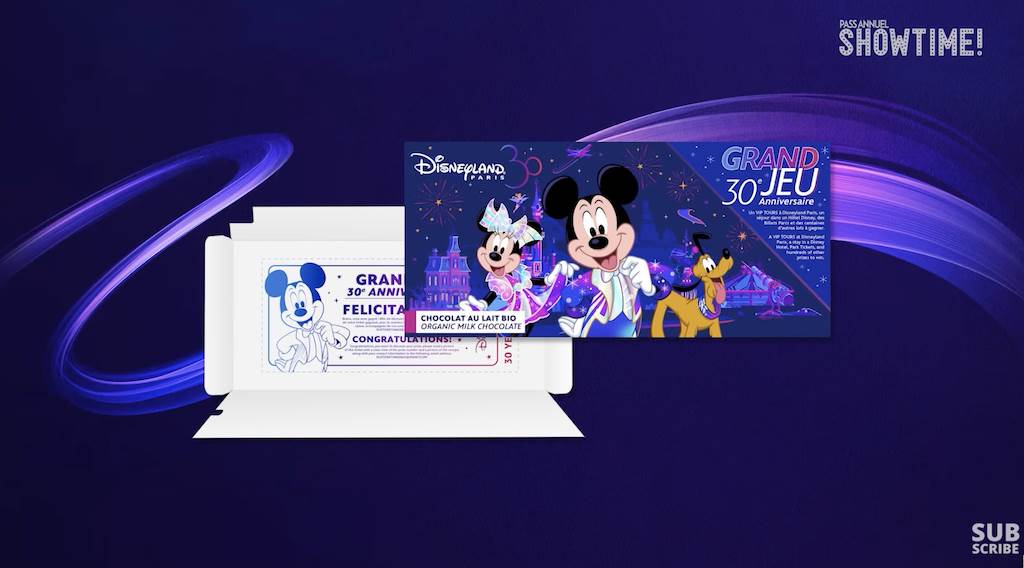 "Grand jeu 30e Anniversaire" Chocolate Bar - available soon in a selection of Disneyland Paris stores; just like Willy Wonka’s golden ticket, guests can win prizes from these bars such as: