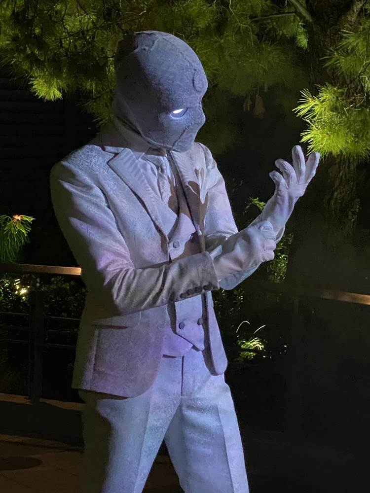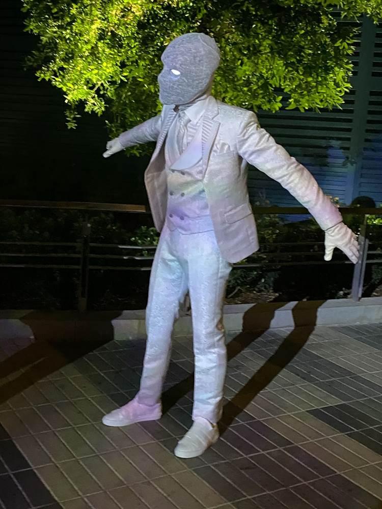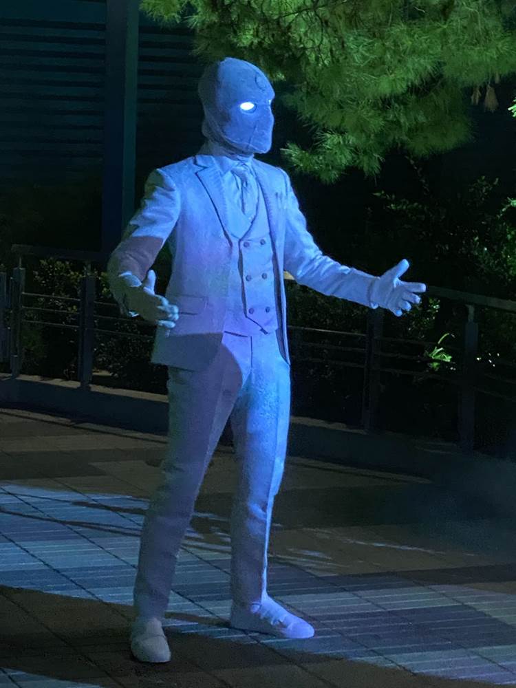 While the previous iteration of Moon Knight at Avengers Campus saw the character mostly lurking atop the land, Mr. Knight is currently greeting guests at ground level. He’s also a bit chatty.