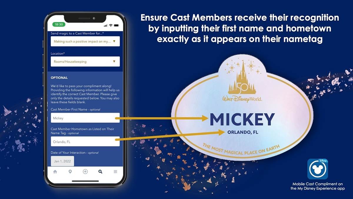 - To access the mobile cast compliment feature, search “Cast Compliment” in the My Disney Experience app. Cast members complimented through the service receive a digital certificate, along with a notification to their leader so they can be further recognized. To ensure that your compliments reach every cast member, be sure to include their first name and hometown as it appears on their nametag – or just ask them where they are from. It’s the perfect way to start a conversation and thank them in person, too.