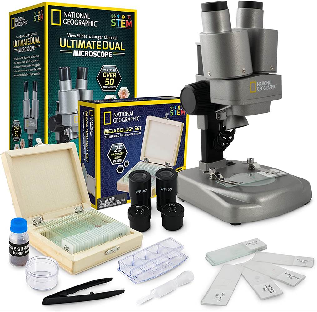 A complete microscope kit for kids ages 8-12 with ultra-bright 20x and 50x magnification, 35 prepared slides and accessories, to help spark curiosity to see the unseen and explore the world around them.