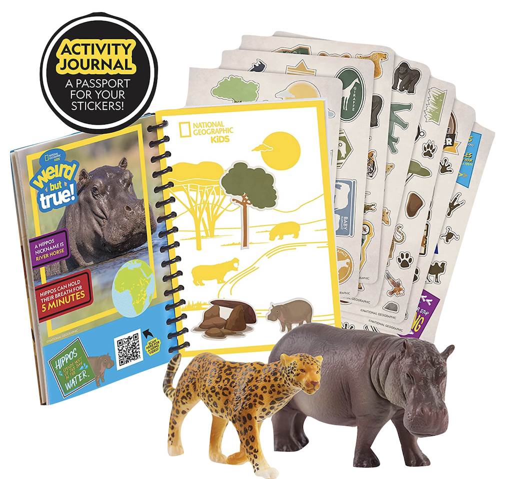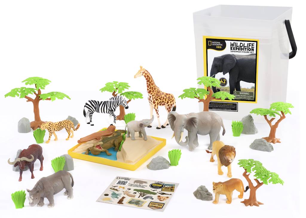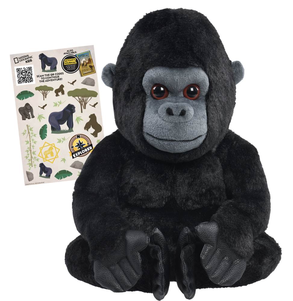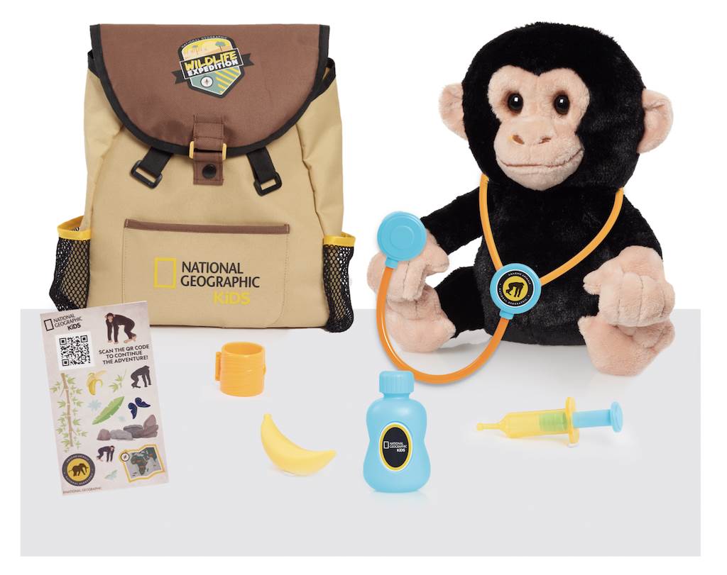 Other kid friendly Just Play National Geographic toys include a veterinarian kit with a stuffed chimp, the hyper realistic gorilla plush, a kids' activity journal and animal figures or a tub of animal figures and trees for creative play.