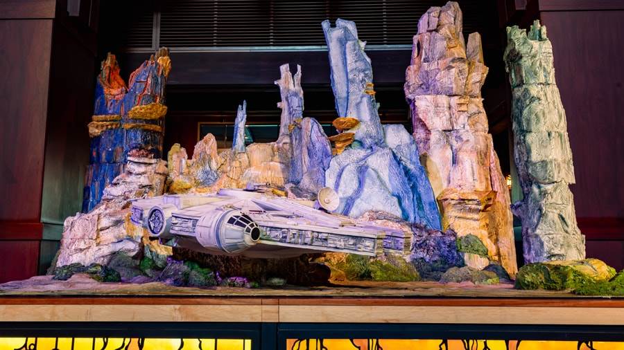 Be sure to check out this display in the lobby of Disney’s Grand Californian Hotel and Spa that’s out of this galaxy, and made from edible ingredients like crisped rice and fondant! This showpiece depicts the Millennium Falcon arriving in Black Spire Outpost and was created by our in-house Disney culinary team. It’s not to be missed!