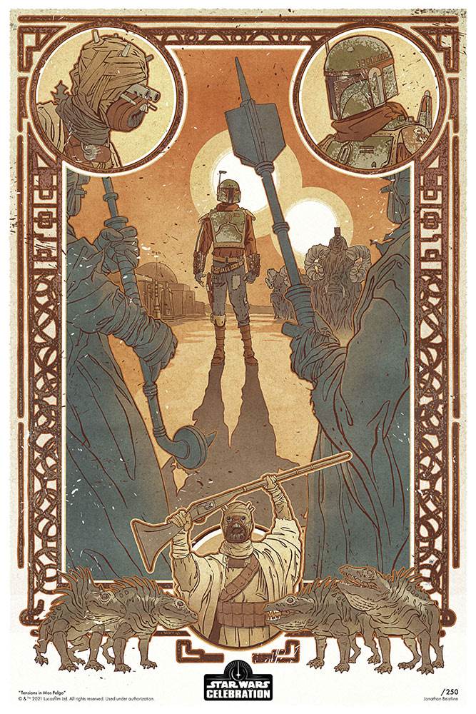 - “When the Mandalorian is attempting to forge an alliance between the Tuskens and Cobb Vanth, there is a tense argument over the campfire that alludes to a hostile history. I wanted to create a piece inspired by that argument that visualized the past encounters between Vanth and the Tuskens in Mos Pelgo. My goal was to evoke the classic Western motifs of the episode and bring tension and anticipation to a standoff between the two sides under the blazing twin suns of Tatooine.”