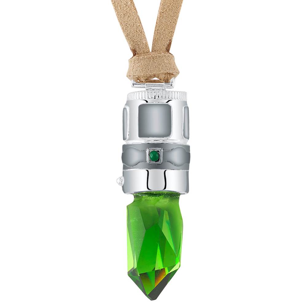 Cast in artisan brass, plated in black rhodium and silver, the pendant features hand painted green enamel details. Sculpted after Yoda’s cylindrical lightsaber as seen in Star Wars: Attack Of The Clones.