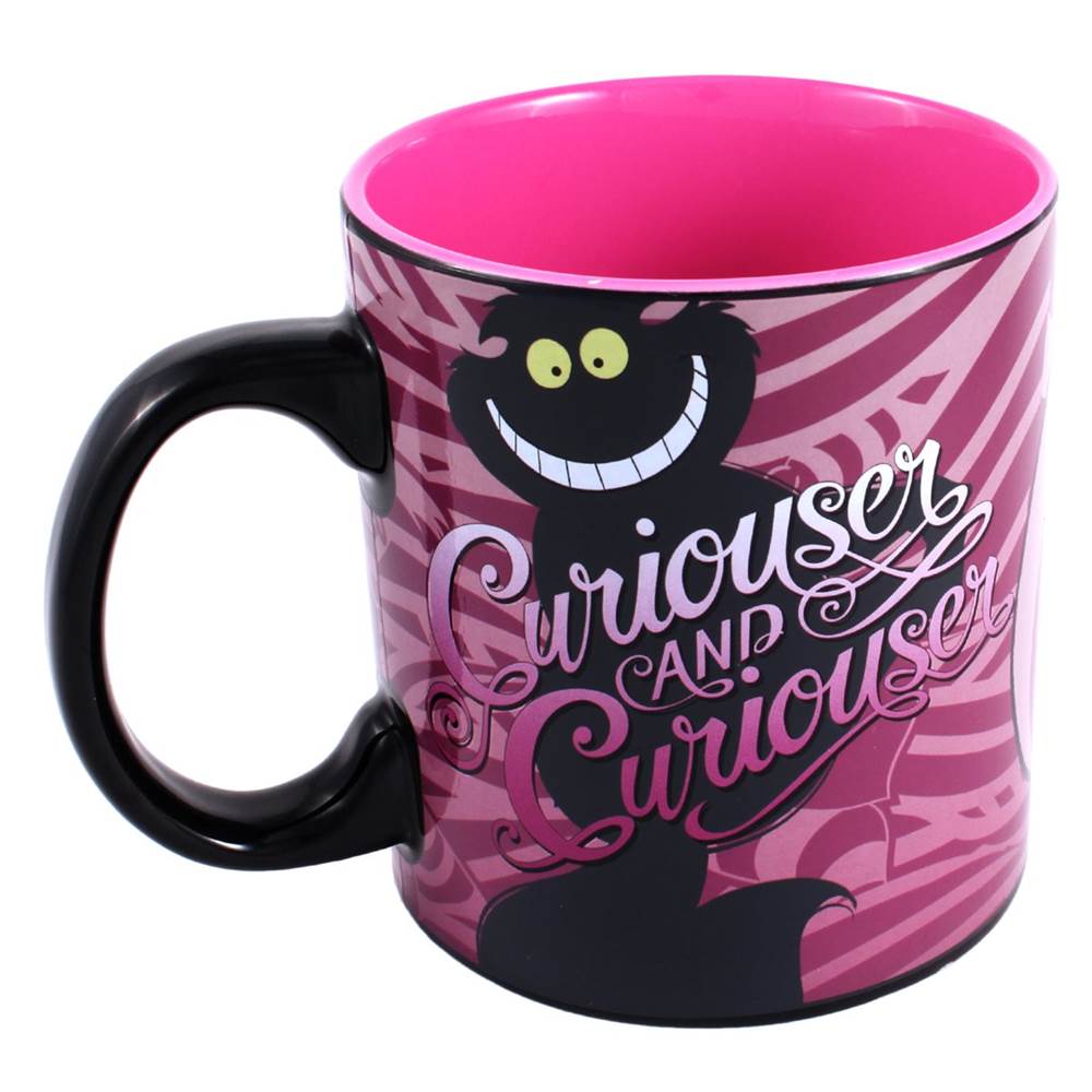 “This cool mug truly is "Curiouser and Curiouser," just like it says. When you first look at it, all you see is a black mug with the Cheshire Cat's eyes and smile. But when you add a hot beverage, the Alice in Wonderland Cheshire Cat 20 oz. Heat-Reveal Mug comes alive with color and the entire cat appears! "