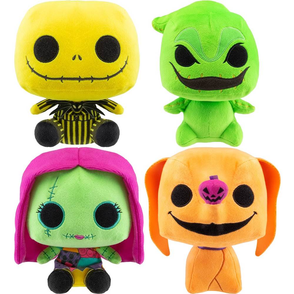 Cuddle with your favorite festive Nightmare Before Christmas characters as part of the Black Light Pop! Plush series. Bring home a case of 6 or purchase Jack, Oogie Boogie, Sally and Zero separately ($11.99 each).