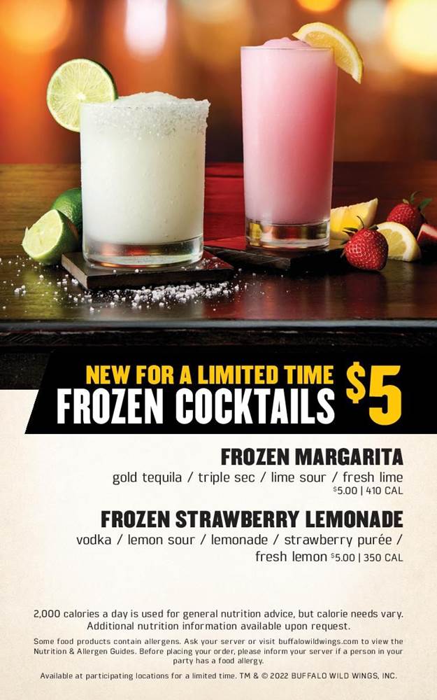 - The best way to wash down world-class chicken wings is with a nice, cold drink. Over Memorial Day weekend, Buffalo Wild Wings at ICON Park is offering $5 frozen cocktails, including: