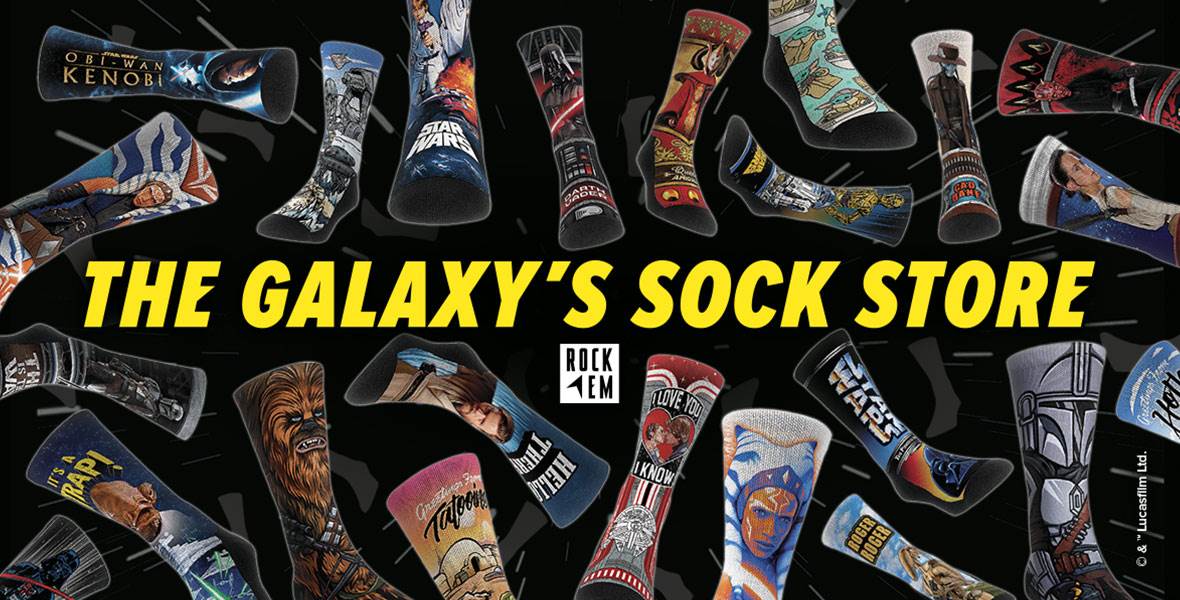 - Rock 'Em Socks will be setting up The Galaxy's Sock Store (Booth #2305 near Hasbro), complete with over 150 unique Star Wars designs from across all of the movies, Disney+ shows, video games, books, and more. Build your perfect pair of socks with an experience exclusive to Celebration—the Star Wars Character Selection Section, where you choose your left and right sock from over 20 different characters! Shop exclusive Shirt and Sock Combos, and keep an eye out for our Galactic Travelers Luggage Set—a custom box set including three pairs of Greetings From location socks, three Star Wars Postcards, and a sticker set to decorate your luggage wherever your travels take you!