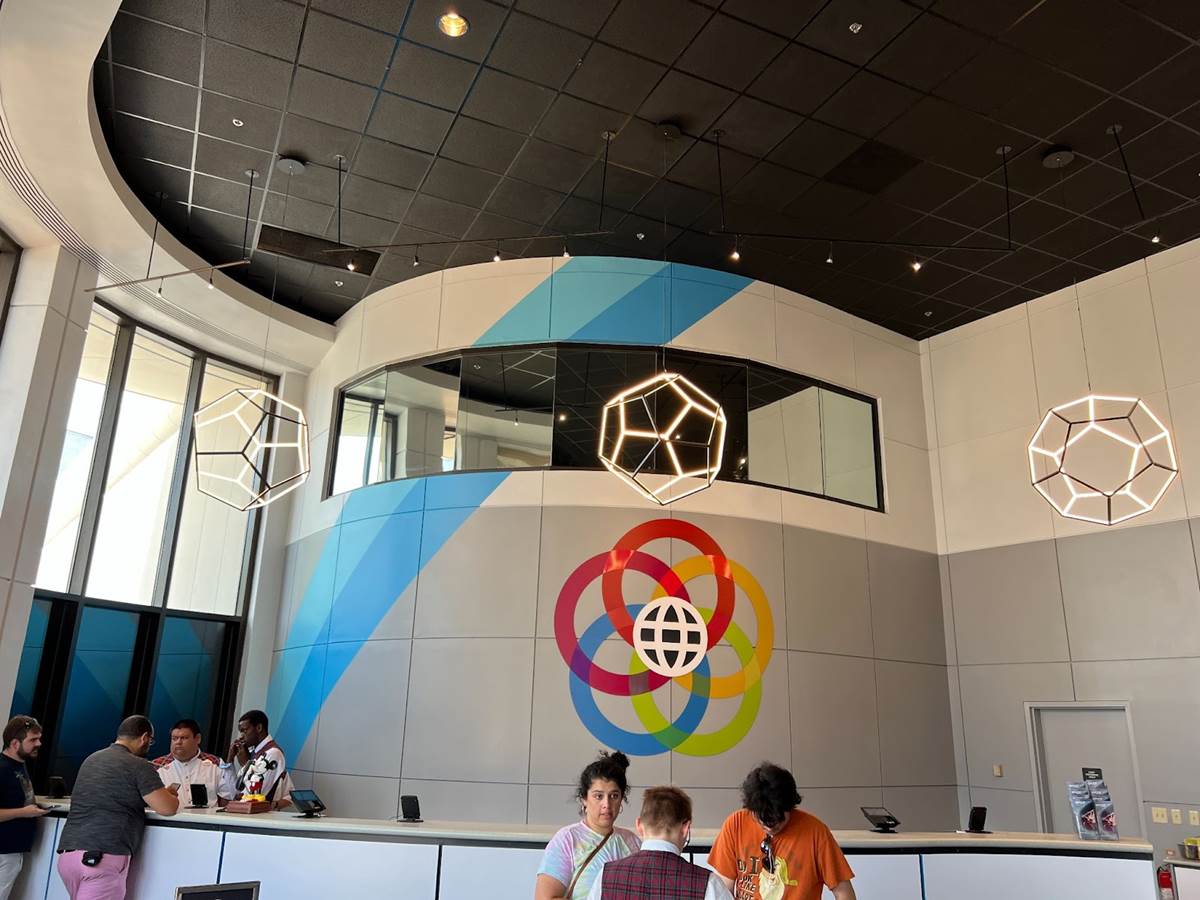 The park’s logo has been added behind the desk and new lighting calls to mind the geodesic pattern of Spaceship Earth, which can be viewed outside the windows of this location.