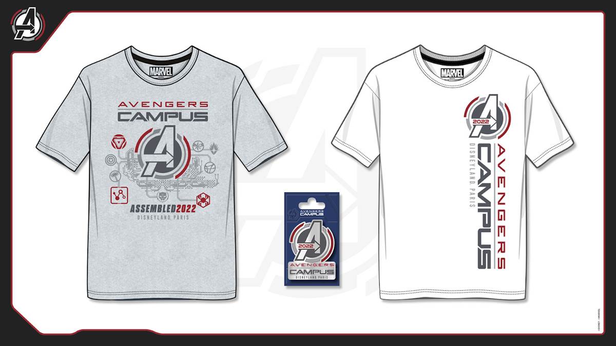 - 2 Avengers Campus "preview" t-shirts available starting Saturday, May 28 at Les Légendes d’Hollywood (Parc Walt Disney Studios), World of Disney (Disney Village) and New York Boutique (Disney’s Hotel New York – The Art of Marvel). A pin will complete the collection later.