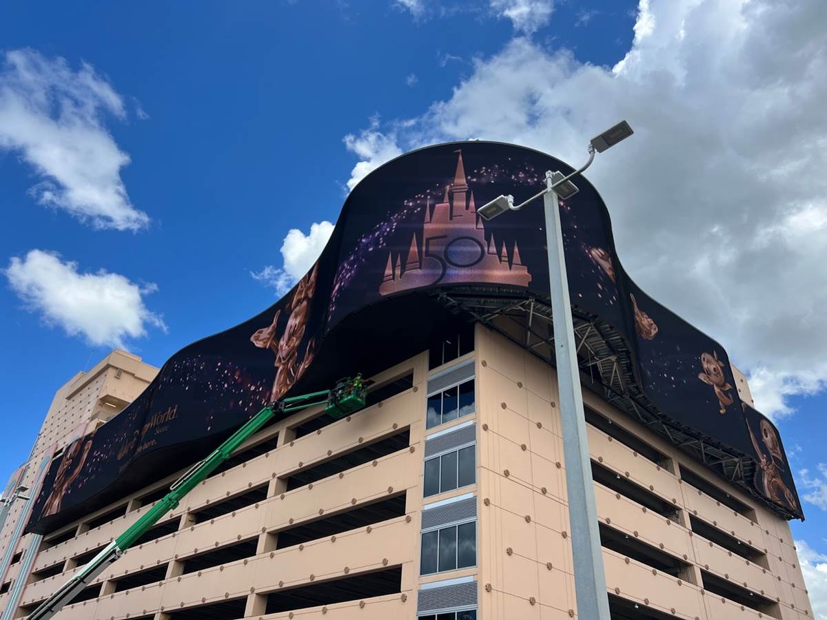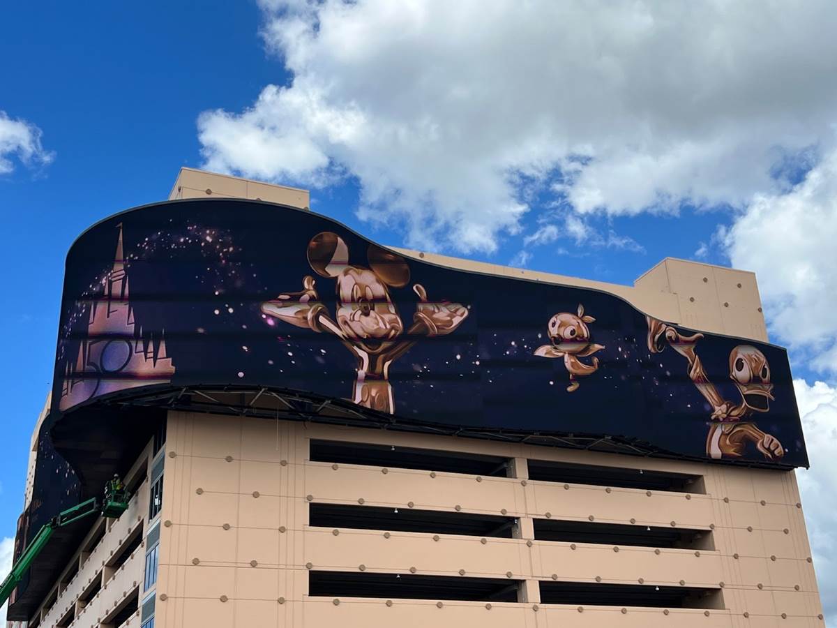 The Hollywood Plaza Garage has been wrapped in a giant screen, serving as an advertisement for Walt Disney World and the 50th anniversary celebrations.