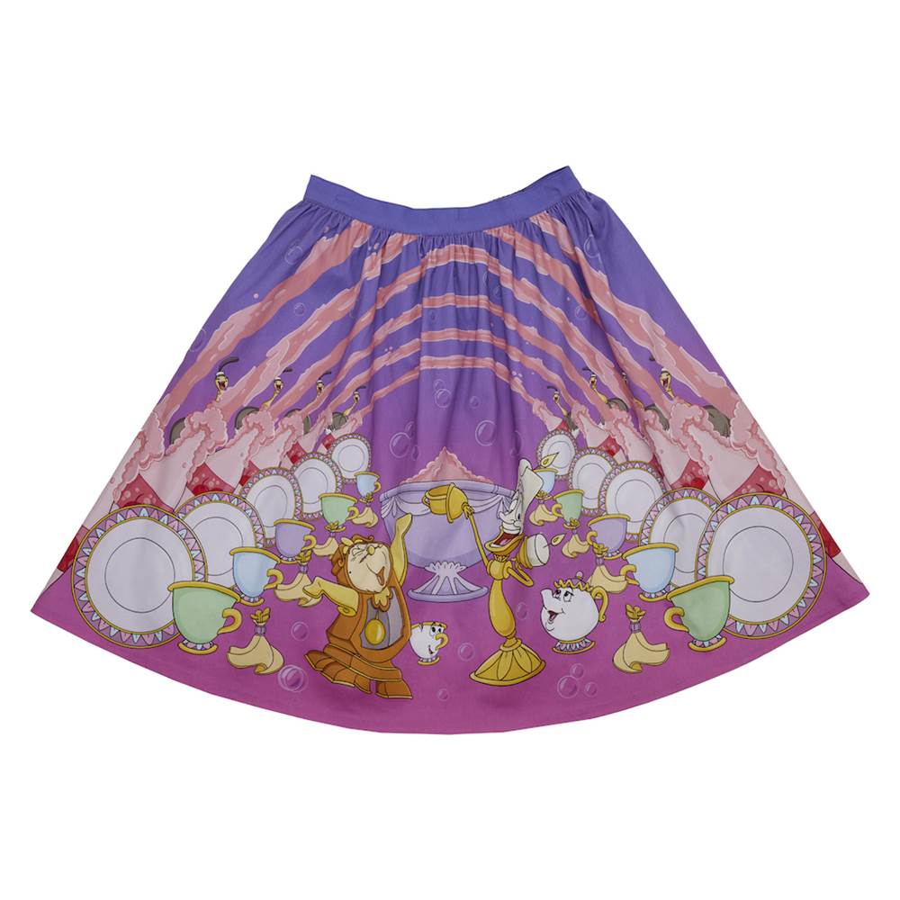 “The skirt pattern recreates the grand finale from the catchy tune featured in Disney’s Beauty and the Beast, with Cogsworth, Chip, Lumiere and Mrs. Potts singing under a regal chandelier and bubbly champagne arches."