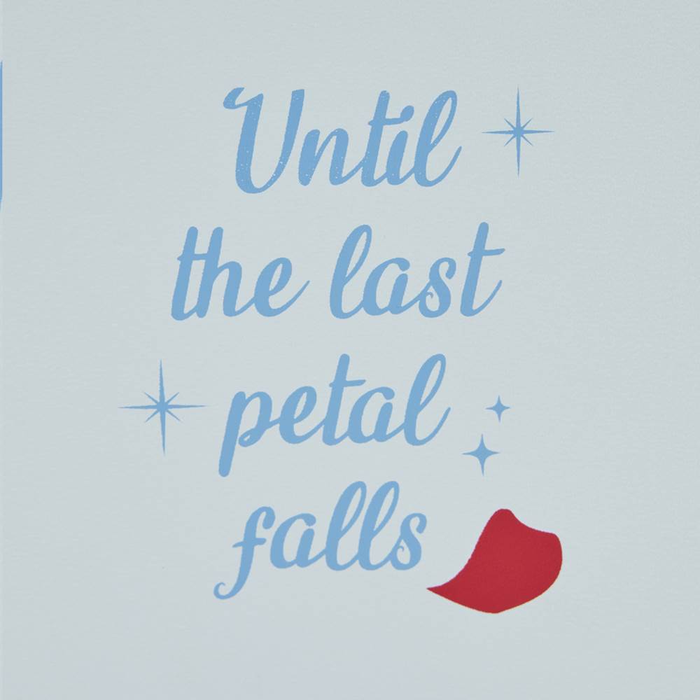 “This spellbound accessory takes the form of the Beast’s bell jar. On the front of the bag, a three-dimensional rose is enclosed in a domed, transparent capsule. Gold sparkles appear near the enchanted rose’s flower while fallen petals rest near its embroidered stem. On the back, a single petal appears next to the phrase, ‘Until the last petal falls.’"