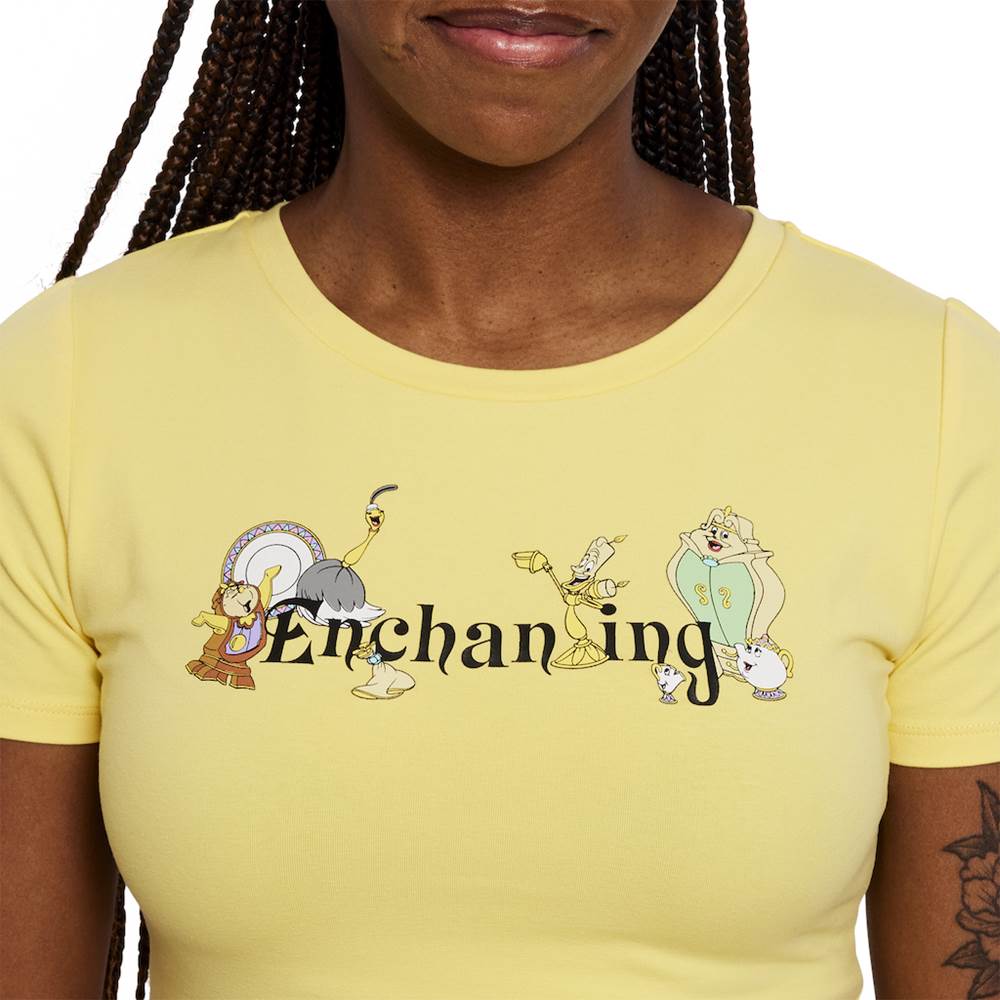 “The design printed on the center front of this soft jersey shirt features Belle’s lively castle friends and reads ‘Enchanting.’"