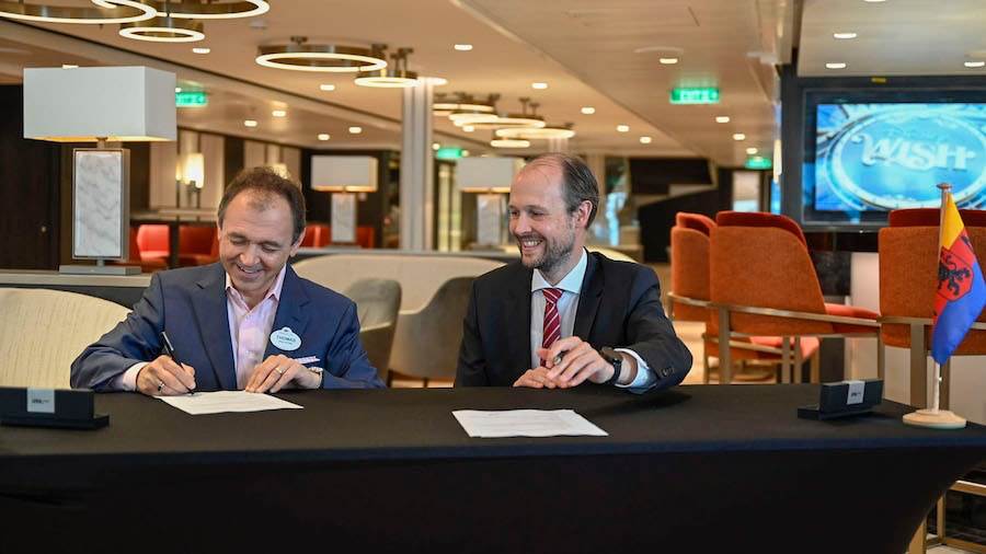 - Disney Cruise Line President Thomas Mazloum and Meyer Werft Managing Director Jan Meyer signed the official documents transferring ownership of the Disney Wish from the shipbuilder to Disney.