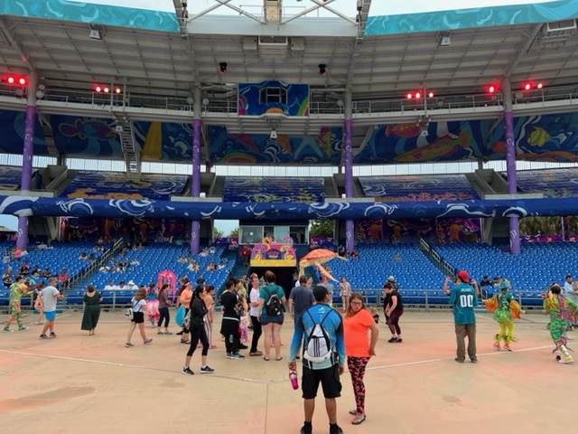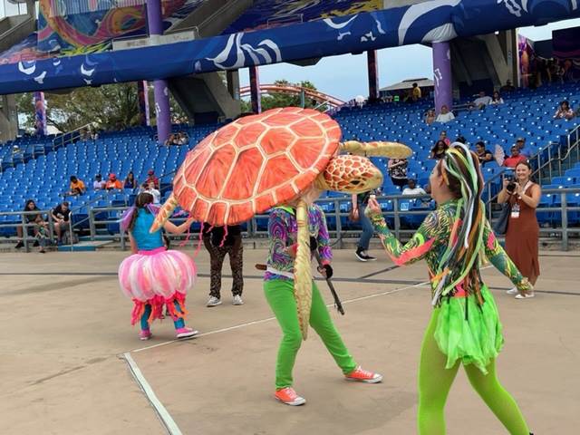 On Electric Ocean evenings The Waterfront transforms early into a party beneath the waves. Our host, dancers, and stilt walkers get the excitement started with a dance party fit for all ages.