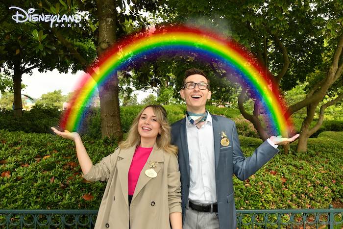 - A photo shared by Disneyland Paris shows the park ambassadors, Carmen Lleo Badal and Quentin Rodrigues posing with the digital rainbow while at the park.