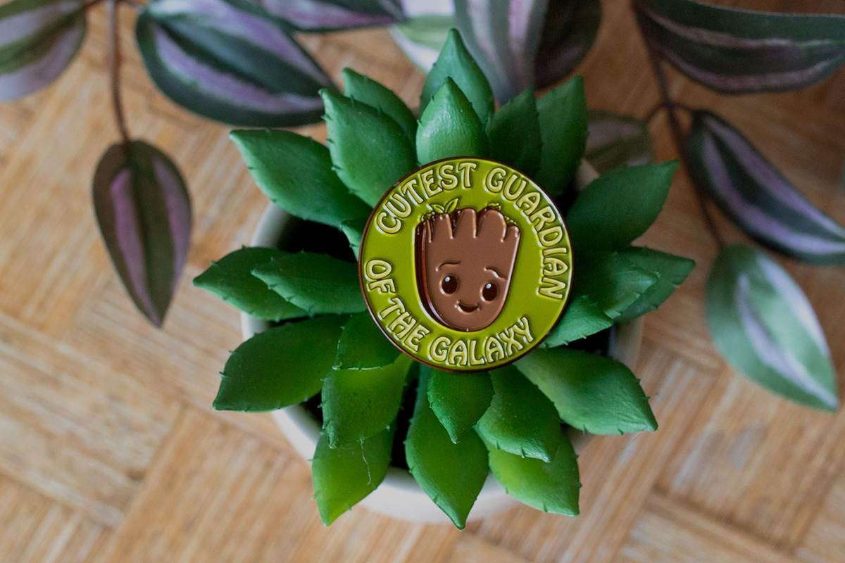 - Bring the little sapling along on all your galactic adventures with this exclusive collector's pin. This adorable enamel pin really grows on you with its cartoonish portrait of Baby Groot and his precious smile. "Cutest Guardian of the Galaxy" lettering encircles the green backdrop.