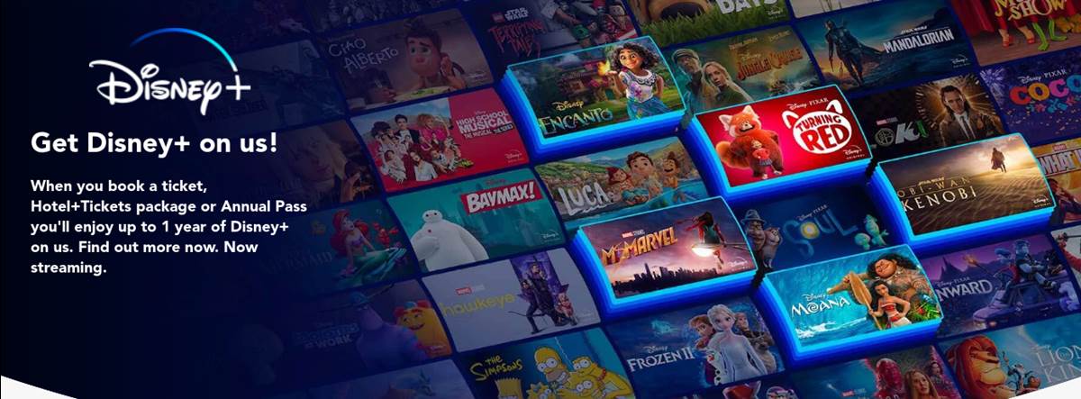 - 12 Months With a Hotel + Tickets Package: Book any Hotel + Tickets package in a Disney Hotel and enjoy 12 months of Disney+.