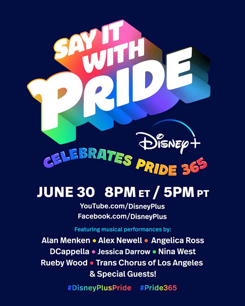 In honor of LGBTQIA+ Pride Month, Disney+ will celebrate its community of employees, talent, and fans with Say It With Pride: Disney+ Celebrates Pride 365 premiering on Thursday, June 30th at 8:00 PM ET / 5:00 PM PT on Disney+’s YouTube and Facebook.