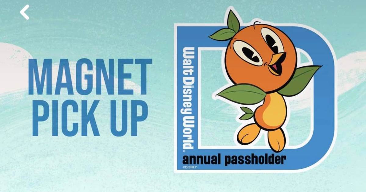 - Get ready, Passholders! The newest Annual Passholder magnet is here. From July 5 through August 5, 2022, the Orange Bird magnet will be available at Disney's Wonderful World of Memories at Disney Springs from 10 a.m to 10 p.m* while supplies last. For your convenience, a virtual queue will be in place to help manage wait times and help you make the most of your time at Disney Springs while you wait. Each Passholder must be present and show their valid Annual Pass card, MagicBand or MagicMobile card and government-issued photo ID to receive a magnet. To access the virtual queue, Passholders just need to follow three easy steps: