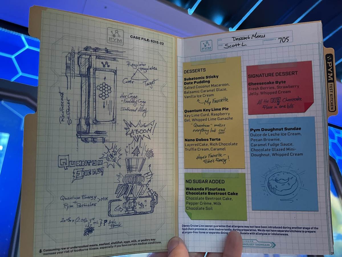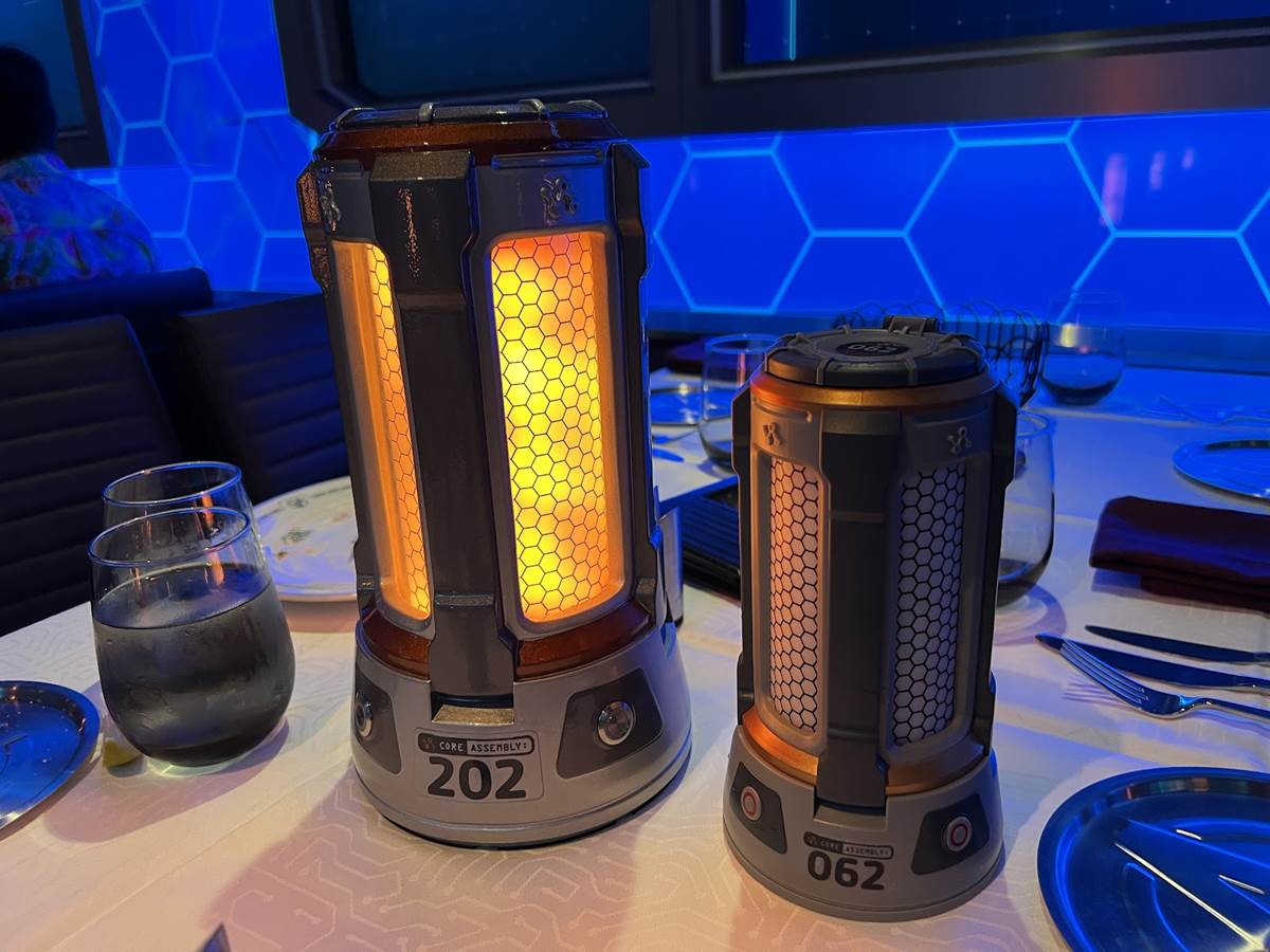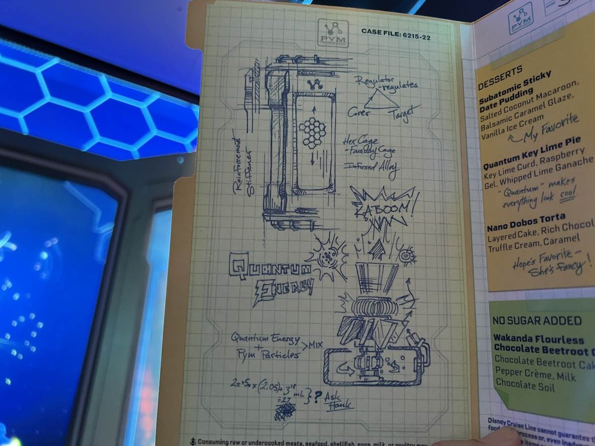 Every table at Worlds of Marvel features an interactive Quantum Core, a brand-new device that can cause objects to shrink and grow remotely. Guests assist Ant-Man and The Wasp as they attempt some small-scale trials, perhaps shrinking oversized luggage for easy stateroom storage.