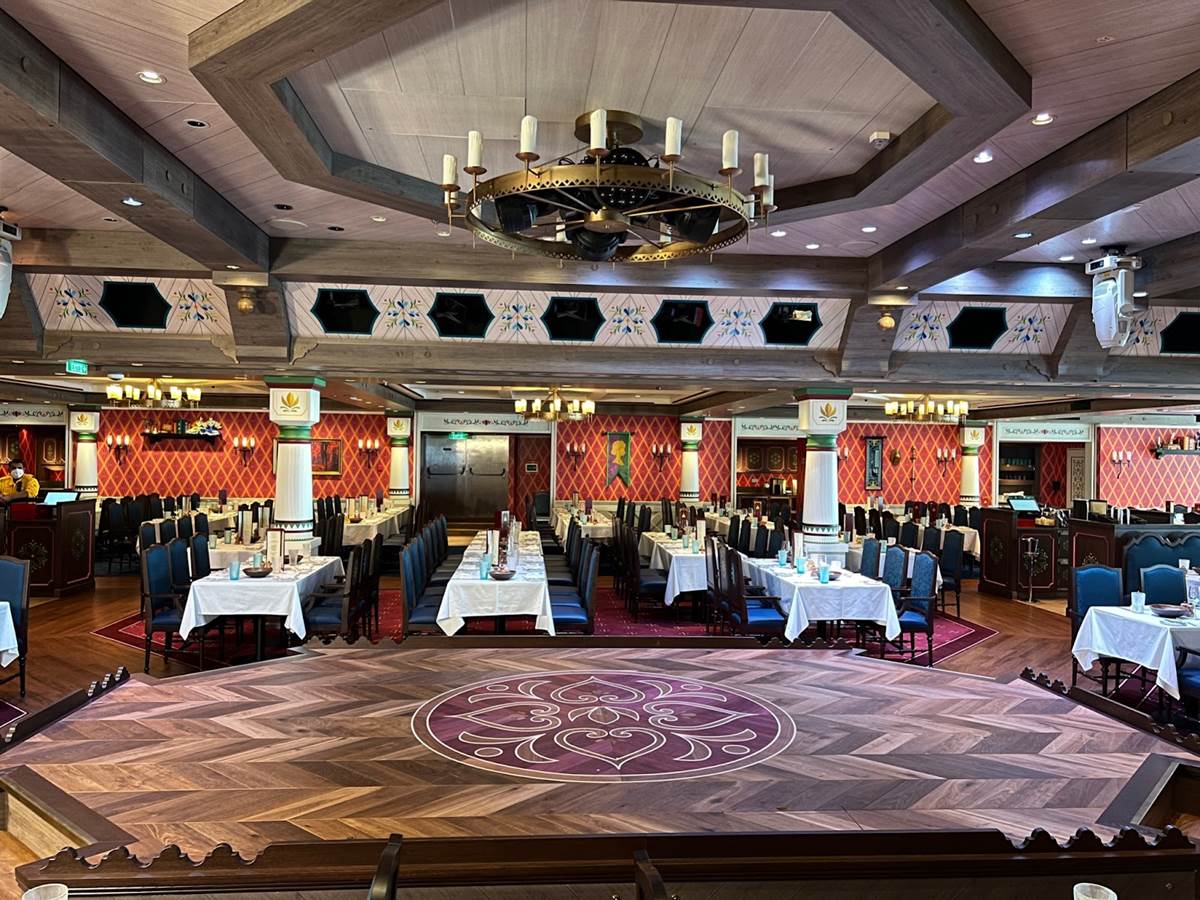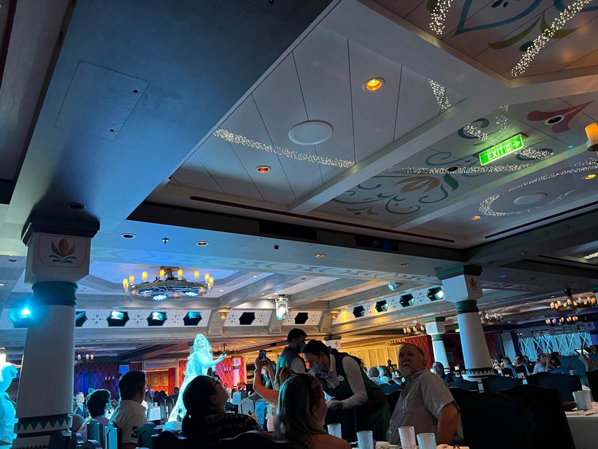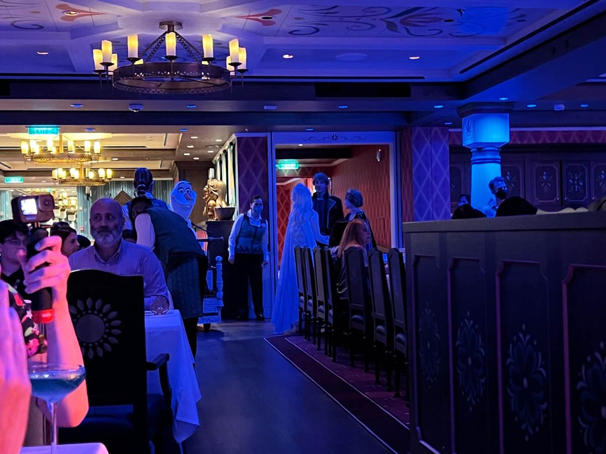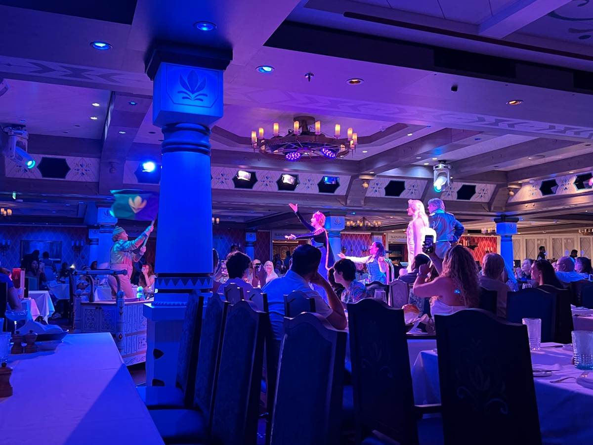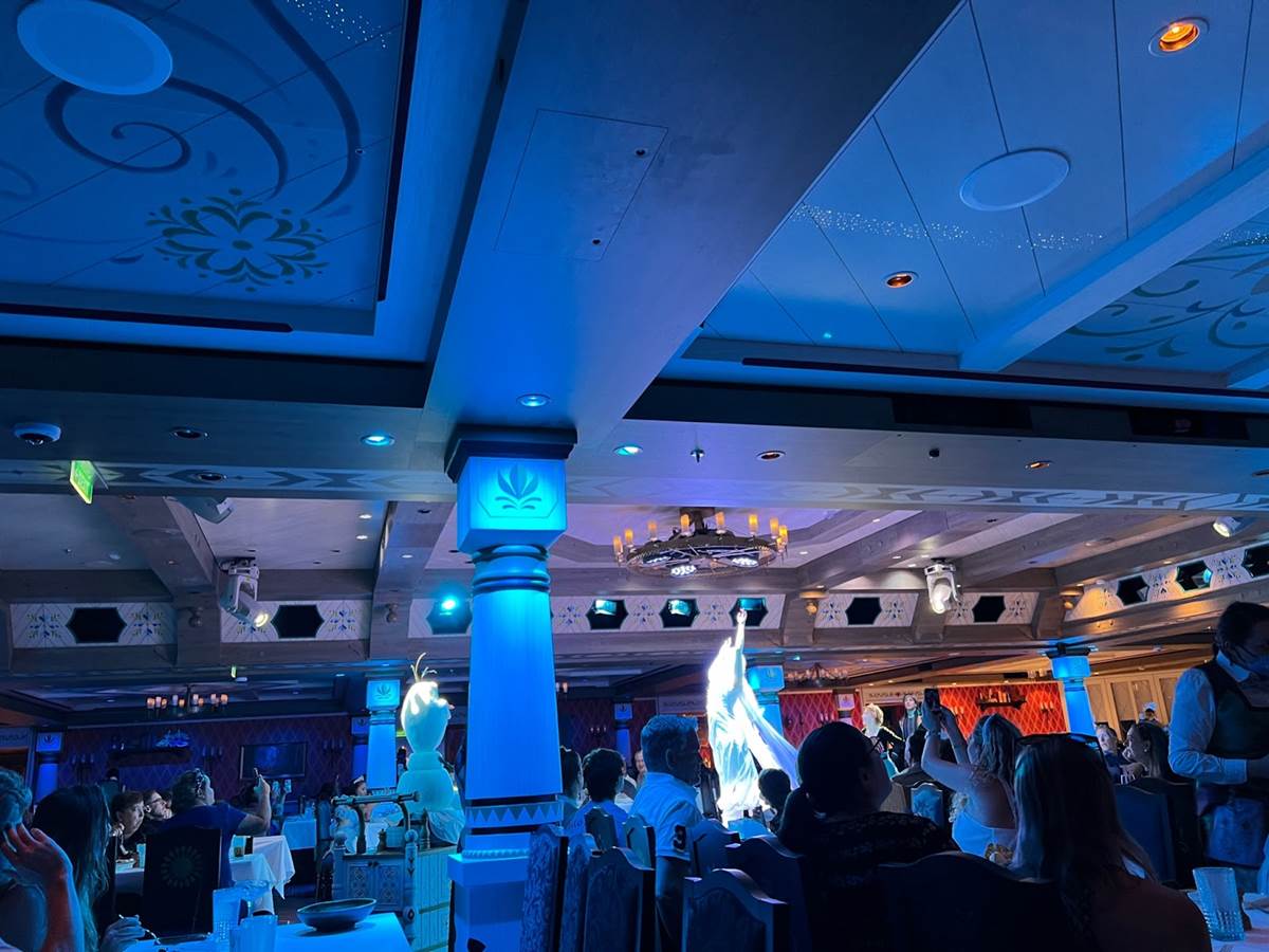 - This theater-in-the-round entertainment venue features dining tables surrounding a central stage, with performances and show effects spreading throughout the room. Invisible fiber optics embedded in the ceiling conjure Elsa’s icy magic, and panoramic windows magically transform from real-time ocean views to the colorful dancing lights of the Aurora Borealis.