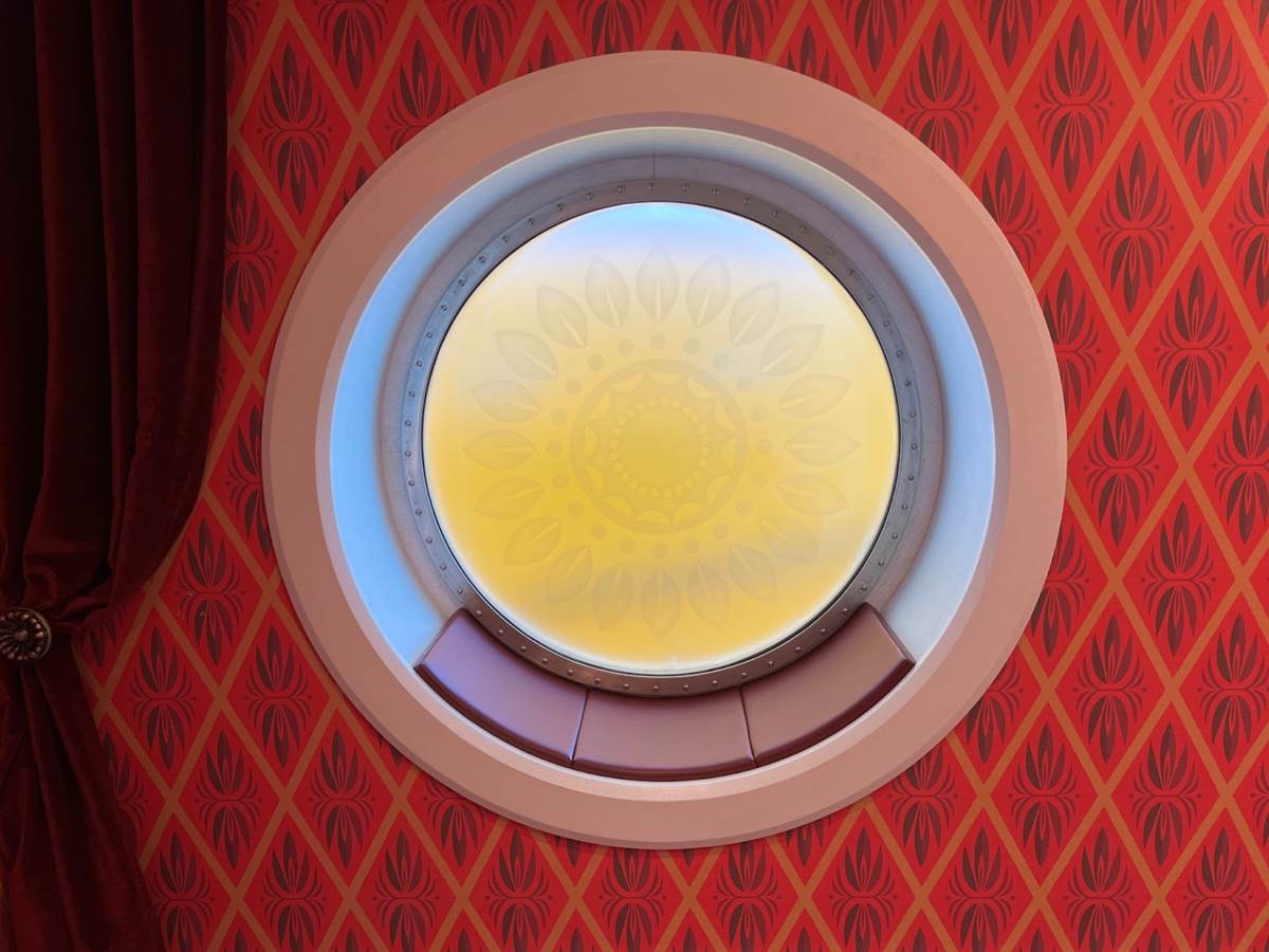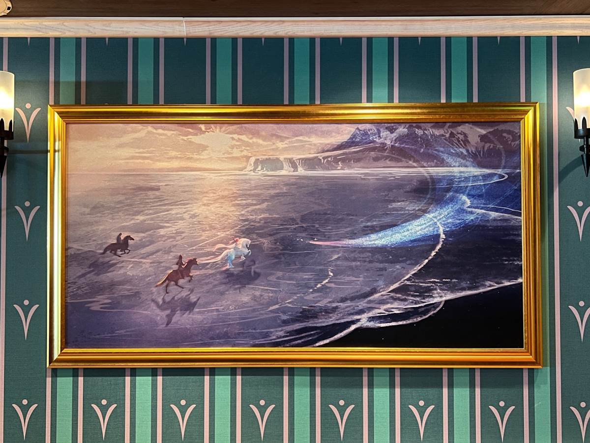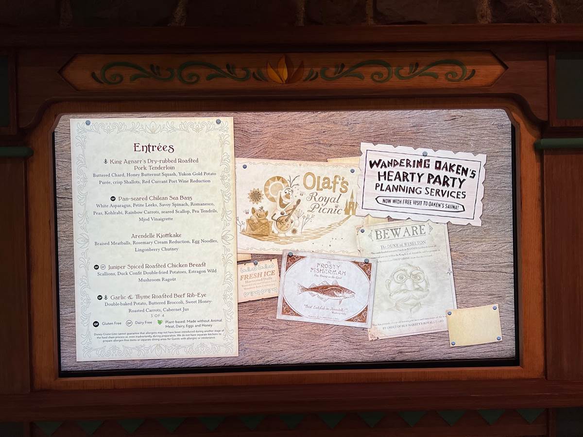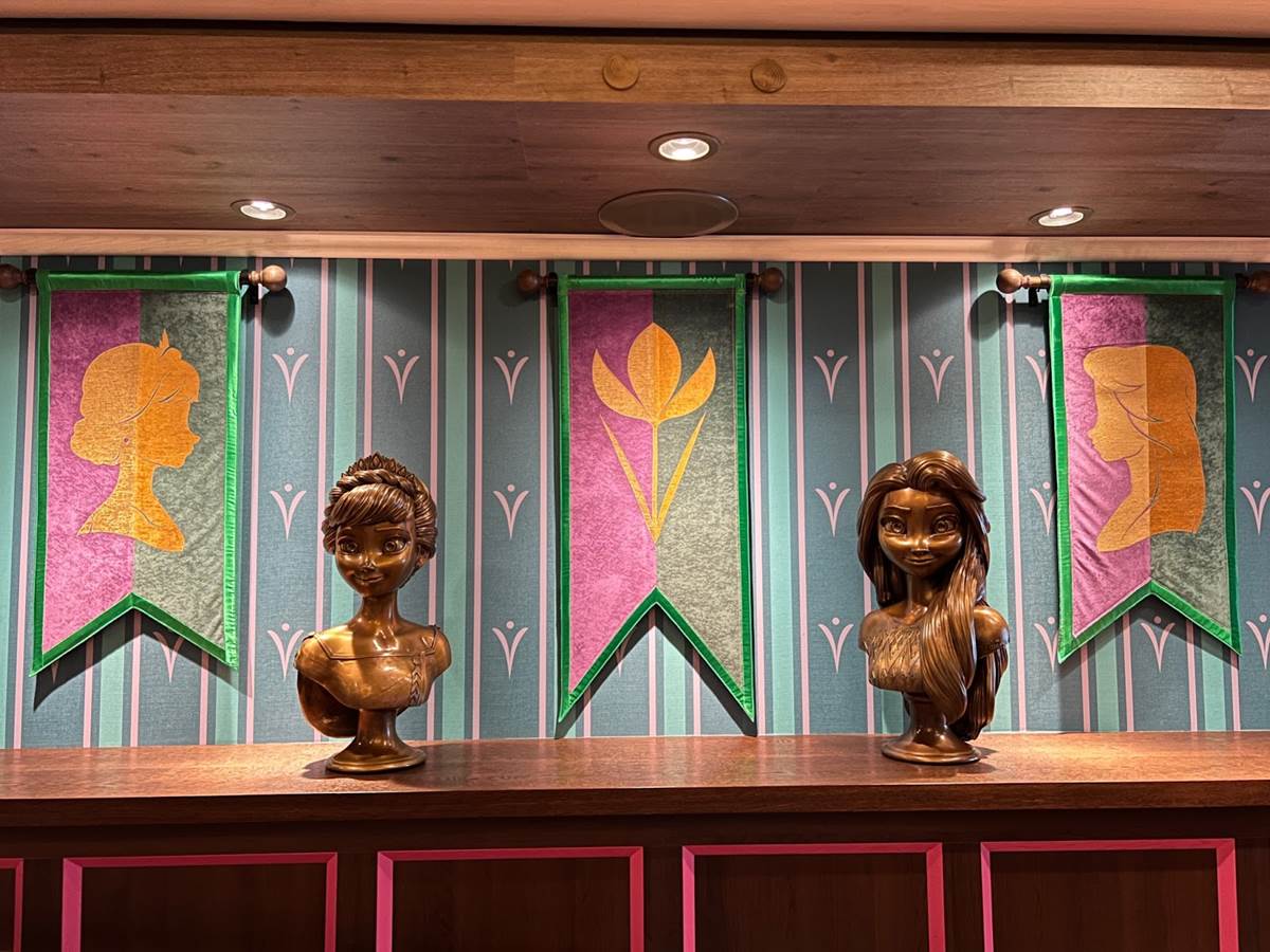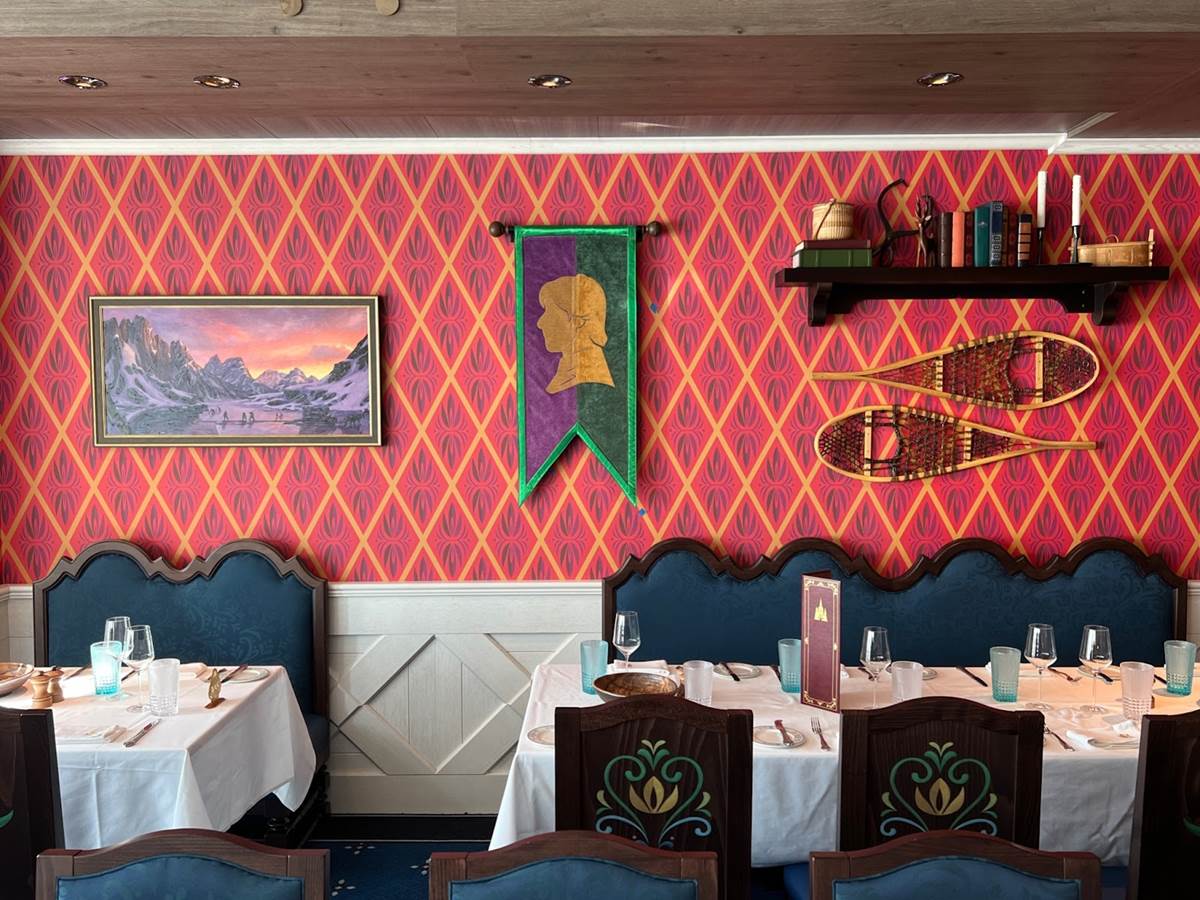- This theater-in-the-round entertainment venue features dining tables surrounding a central stage, with performances and show effects spreading throughout the room. Invisible fiber optics embedded in the ceiling conjure Elsa’s icy magic, and panoramic windows magically transform from real-time ocean views to the colorful dancing lights of the Aurora Borealis.