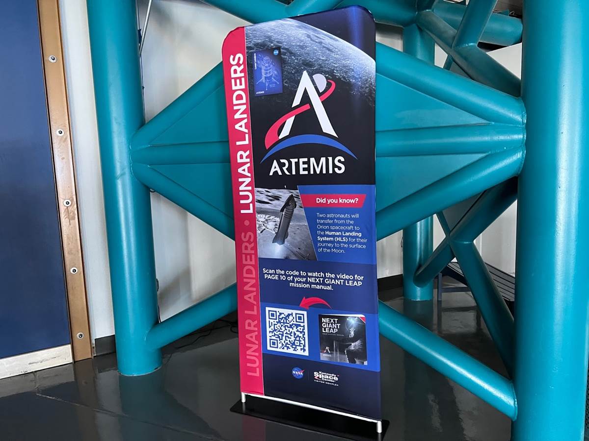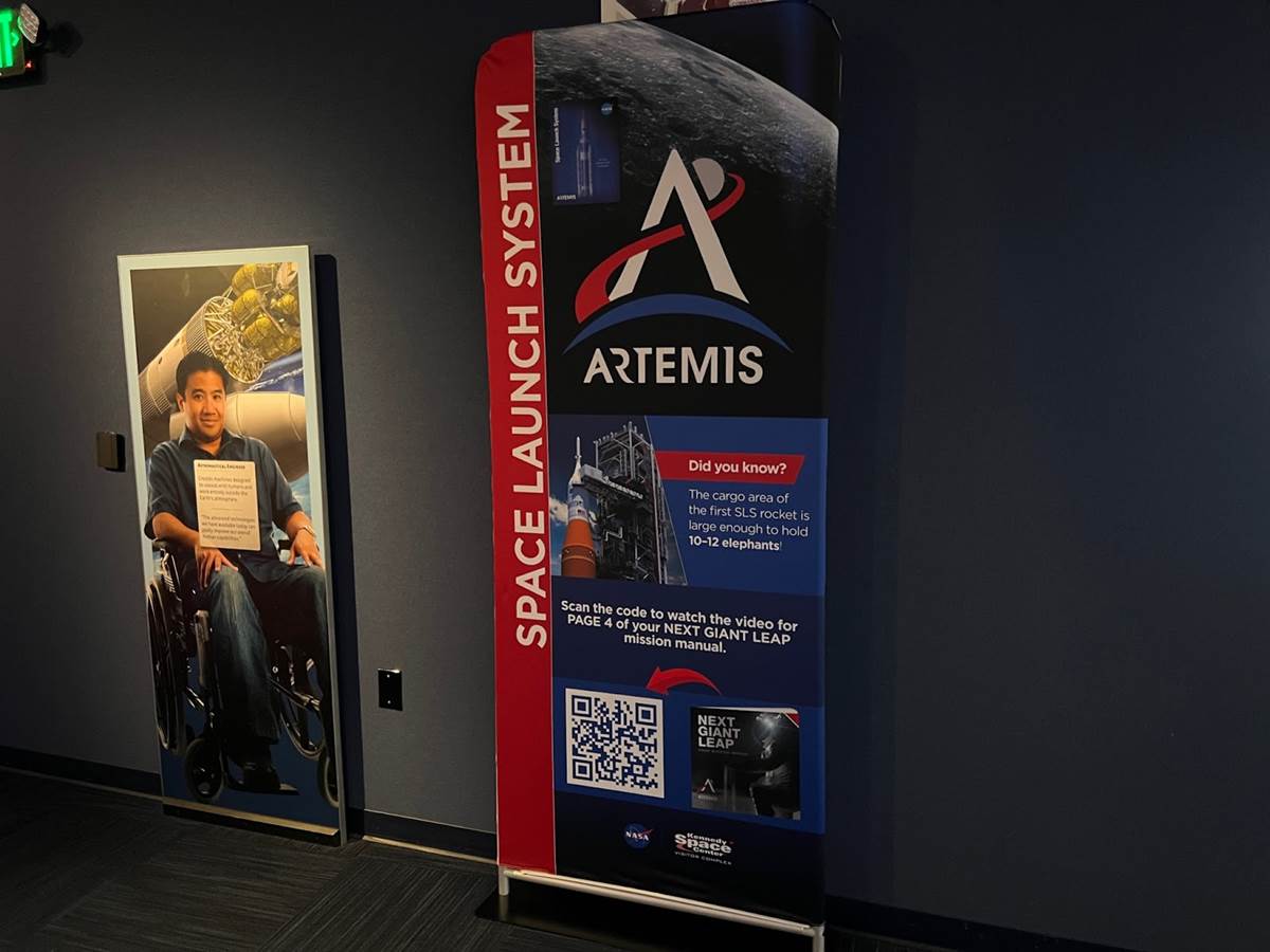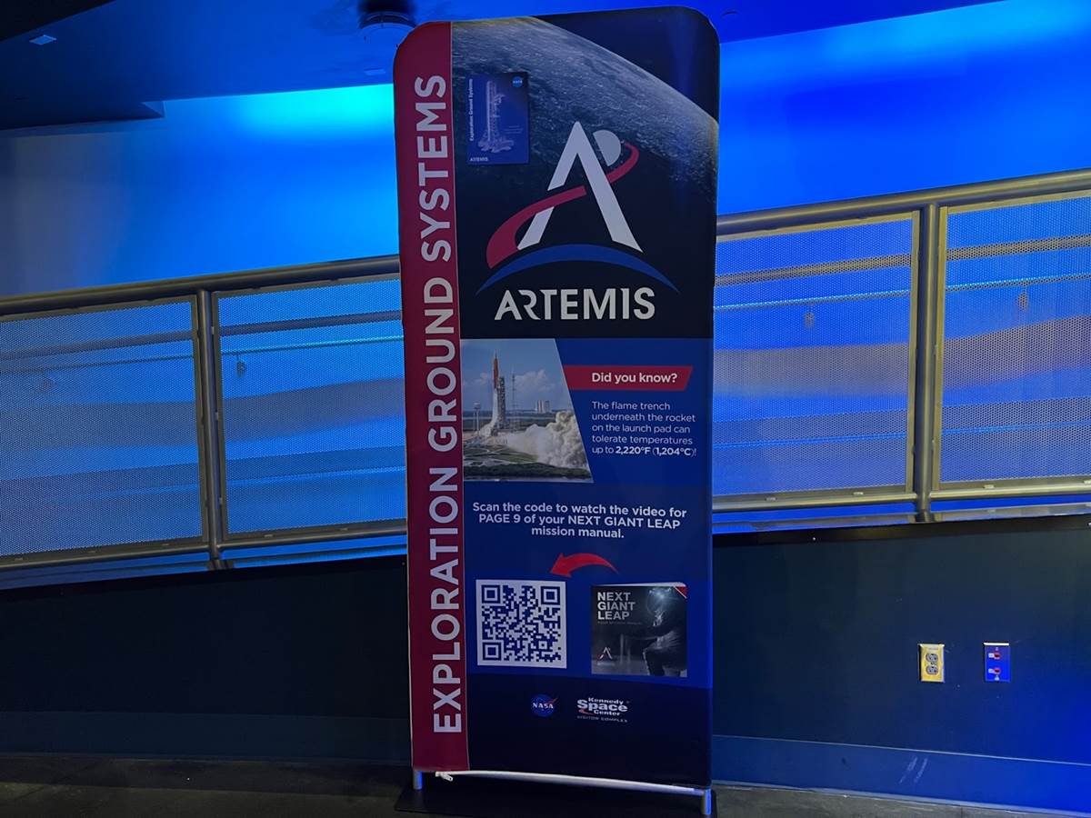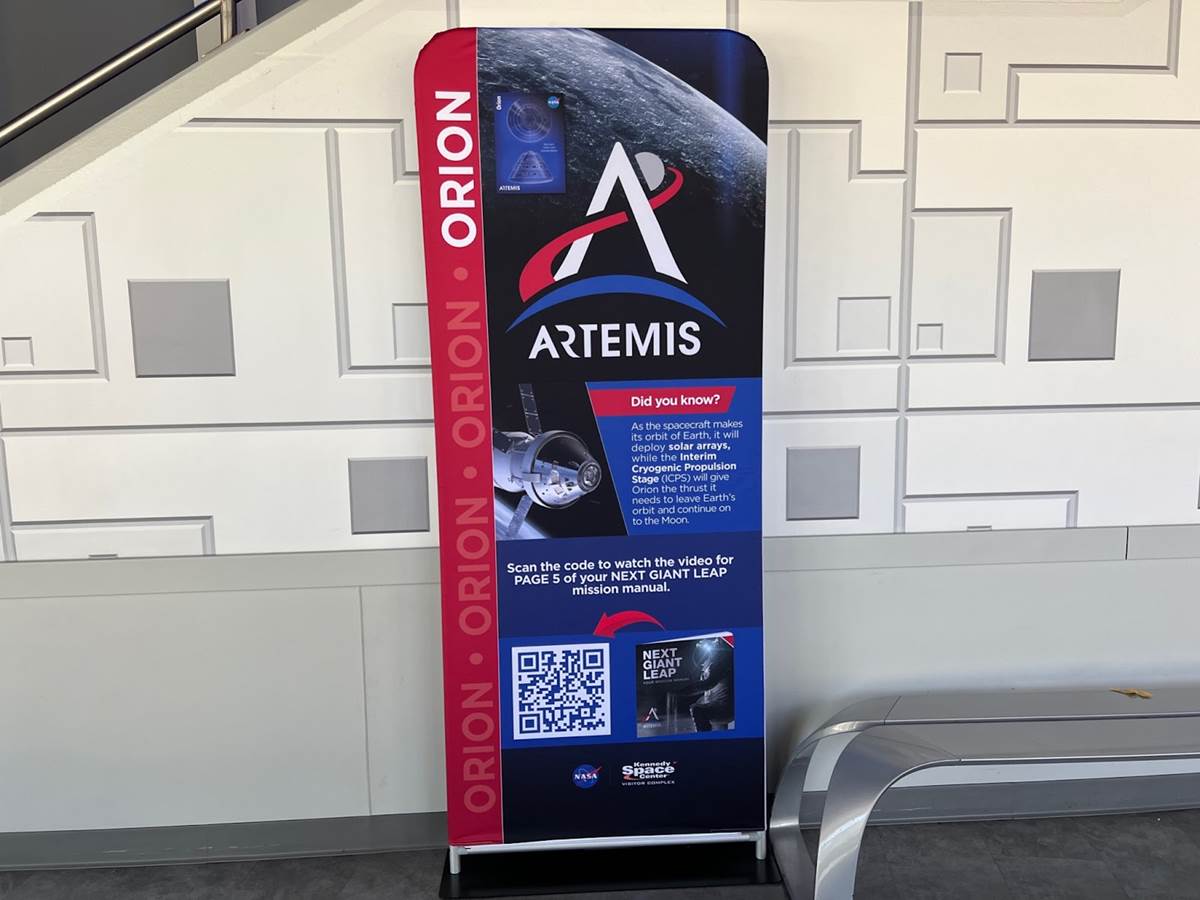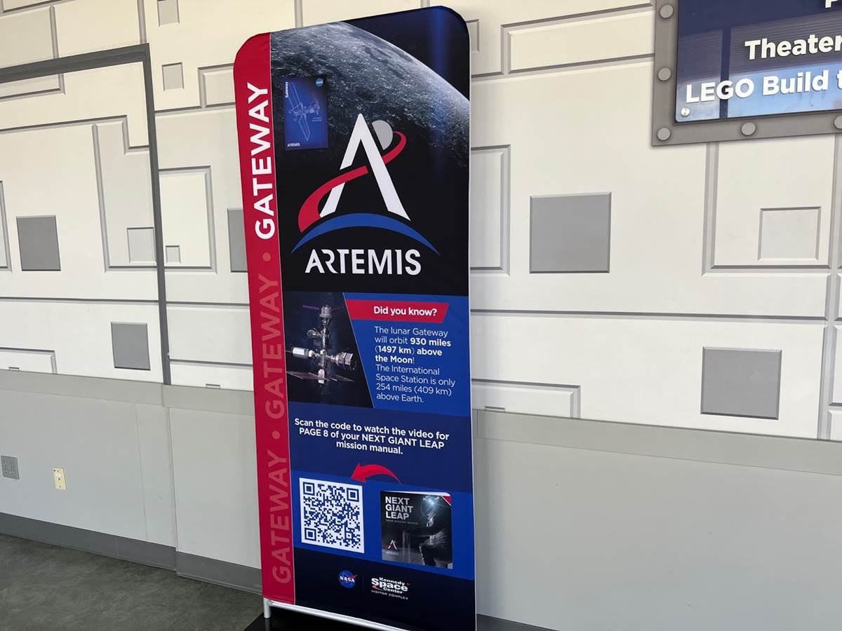 Each location on the Artemis Adventure has a banner with a QR code that takes you to a YouTube video about that subject. The Orion location is listed under the old name of the exhibit NASA Now but is actually outside the new LEGO Build to Launch.