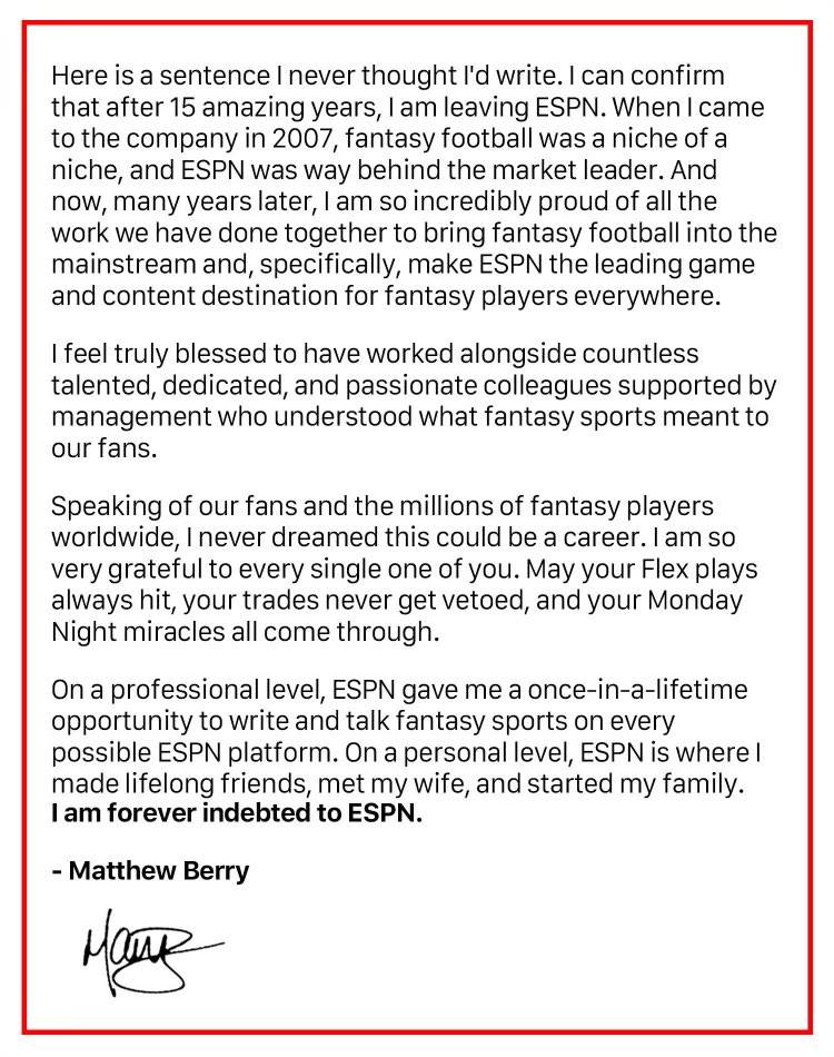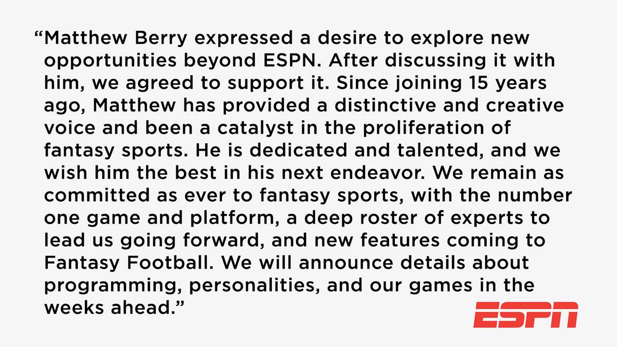 - Here is ESPN’s full statement regarding Matthew Berry’s departure: