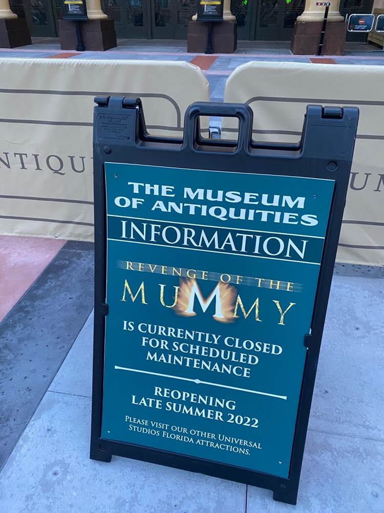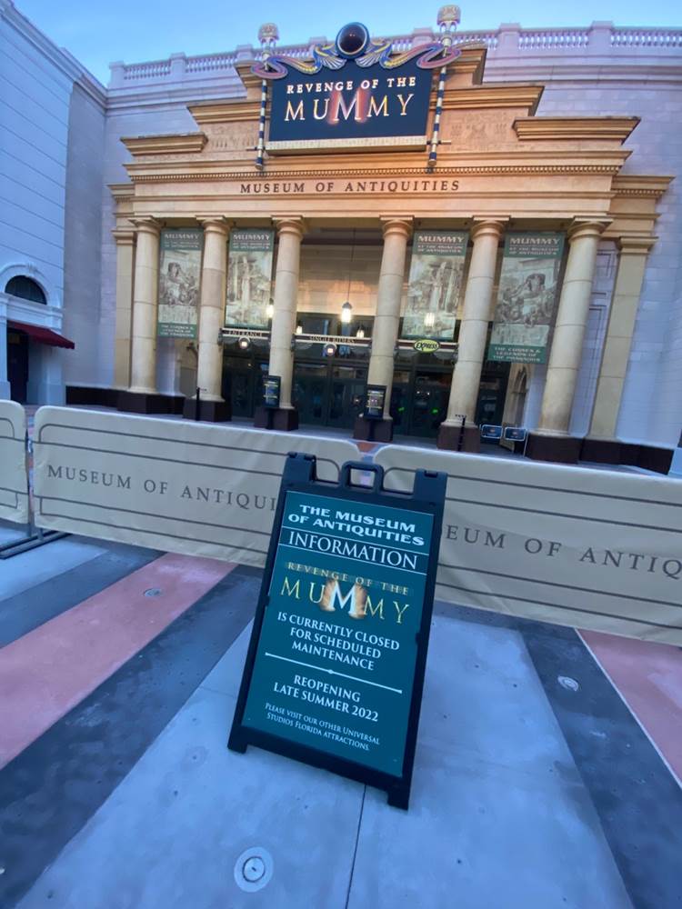 Signage indicates that Revenge of the Mummy will reopen late summer 2022, although we do not currently have an official date.
